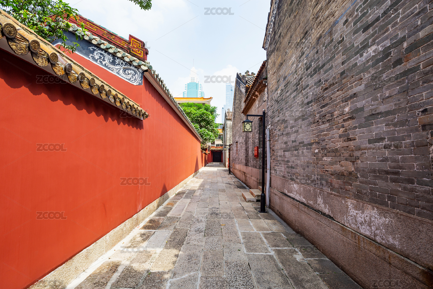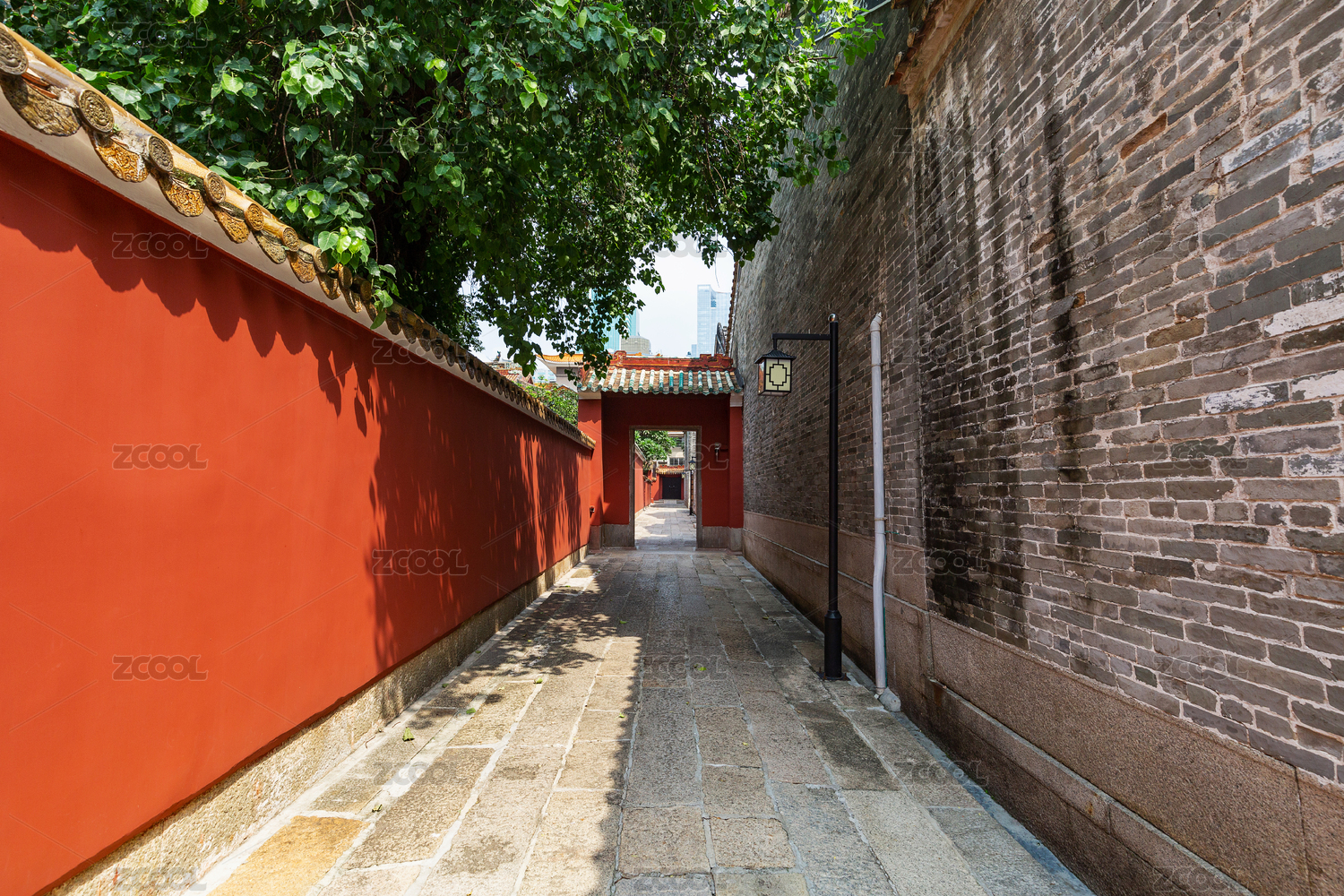 中国寺庙里一条狭长的通道,一面是青砖墙,一面是红色的墙