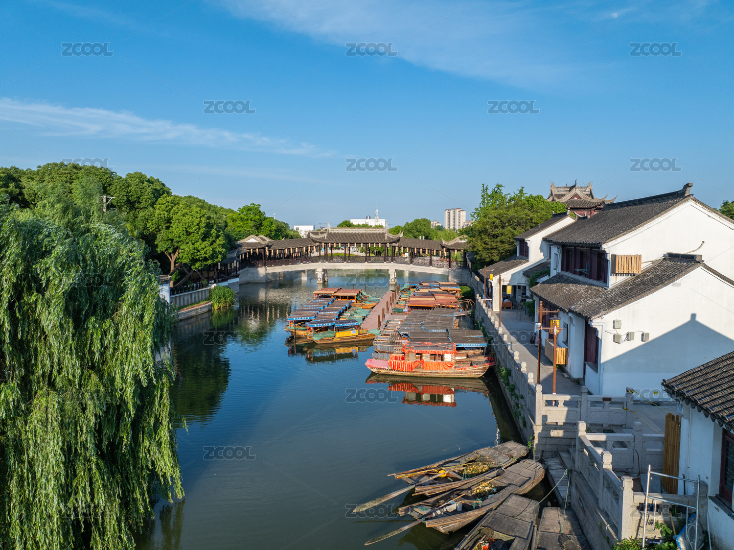 中国,江南水乡,古镇,河道,游船,老房子,绿树,屋檐,青瓦,无人