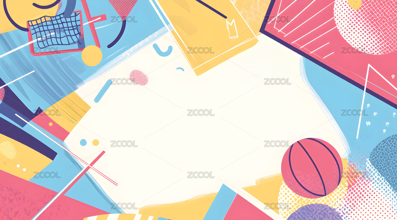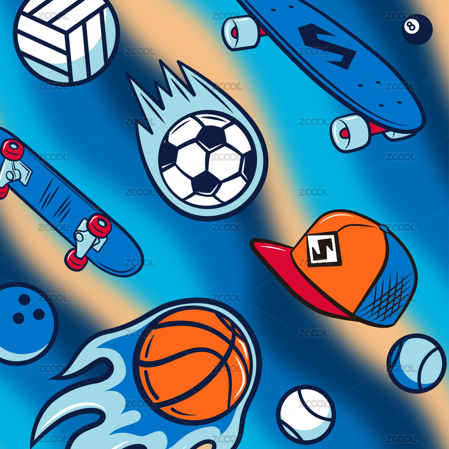 书本笔袋笔橡皮尺子篮球等文具无缝拼接背景