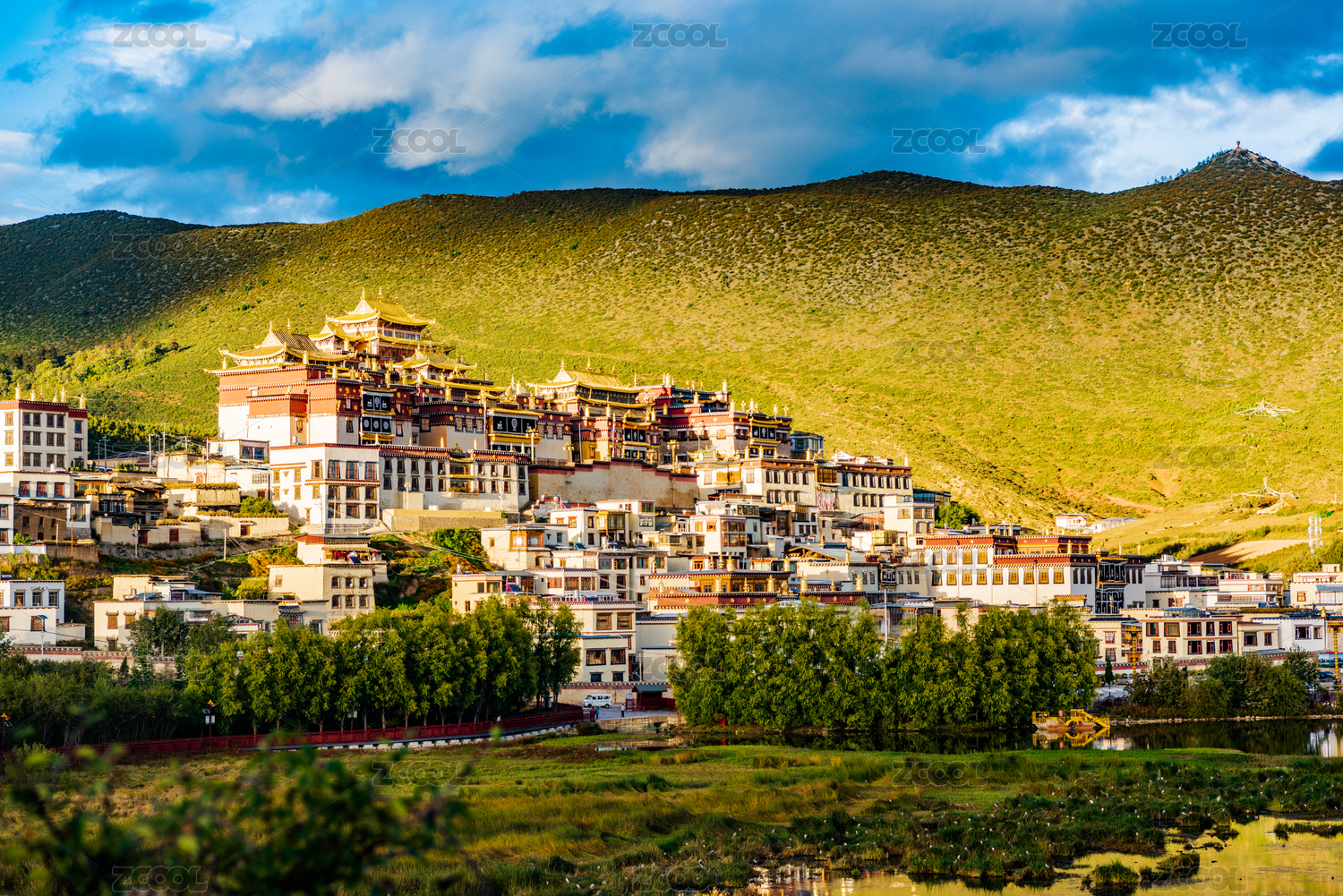 云南,香格里拉,松赞林寺,金黄,黄色,秋天,雨后,多云,晴天,蓝天