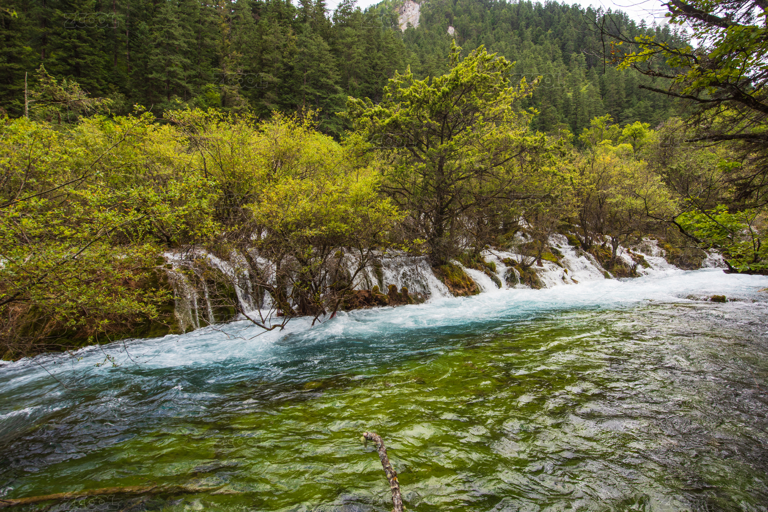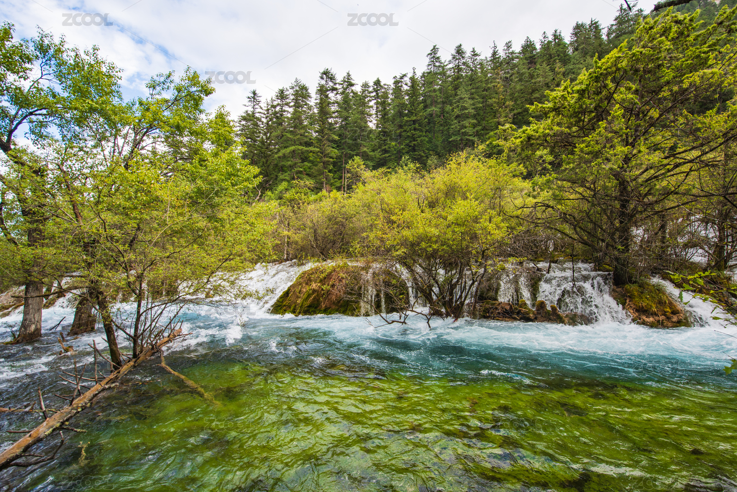 四川,九寨沟,瀑布,水流,白色,树木,晴天,白云,钙华,落差
