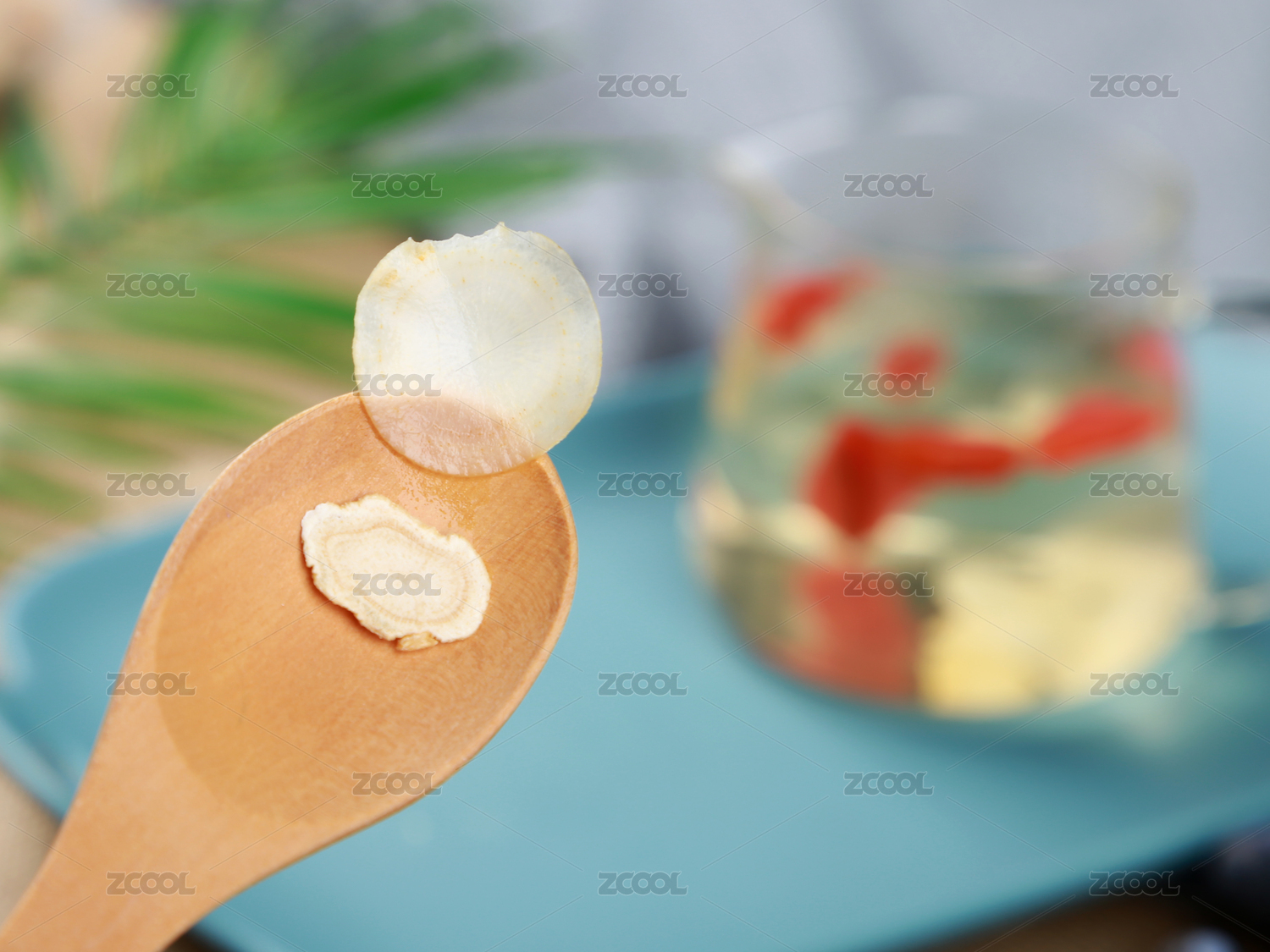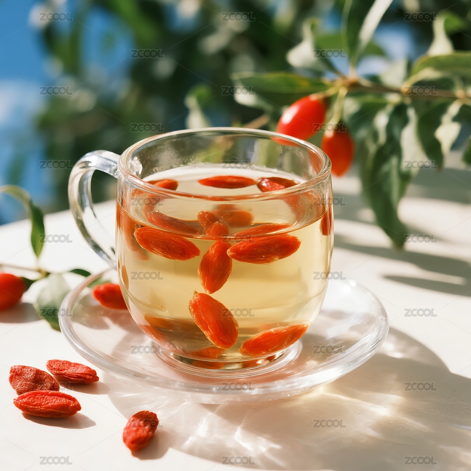 保健饮品黄芪枸杞茶摆放在桌面上特写