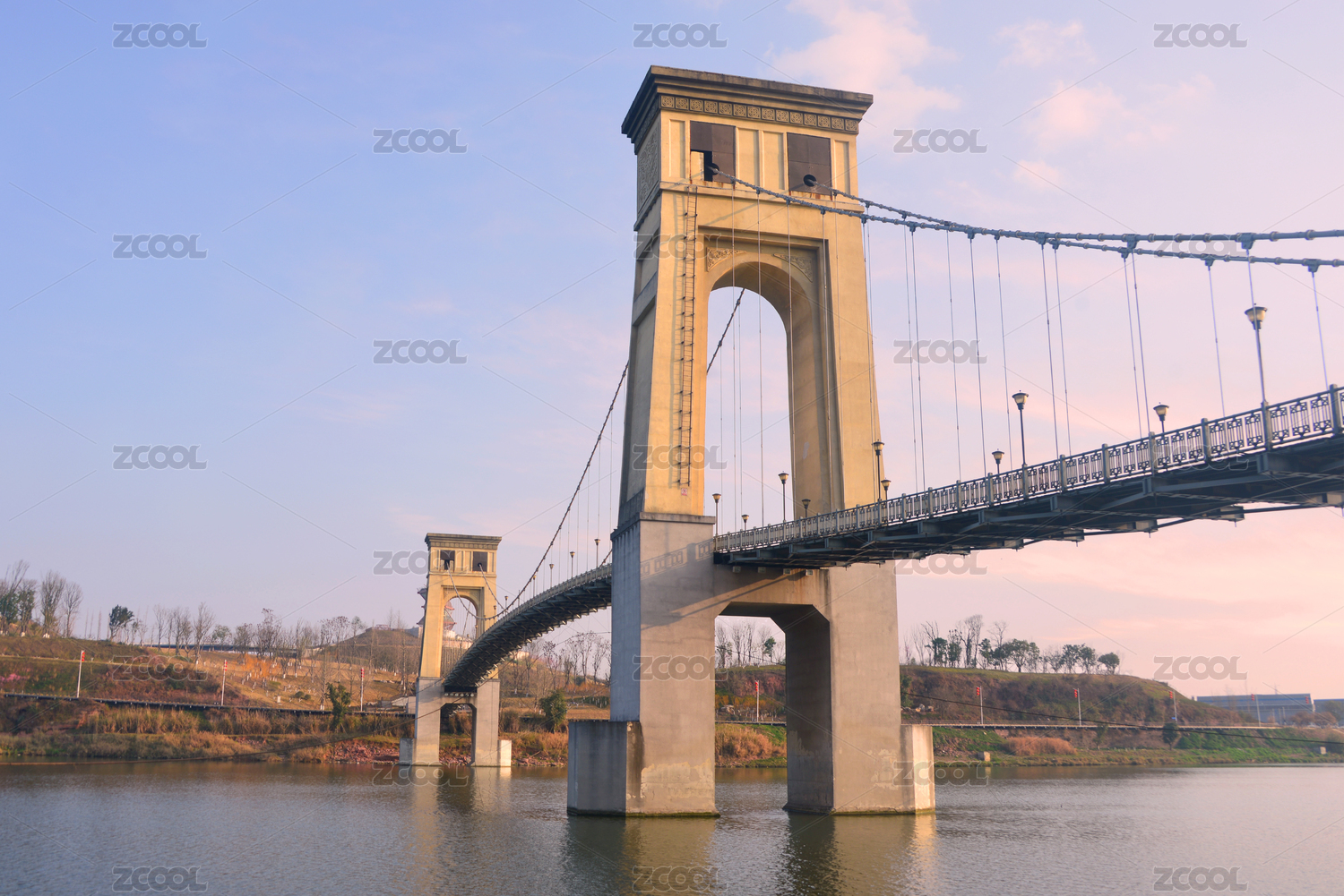 中国四川成都金堂沱江畔科玛小镇索桥夕阳