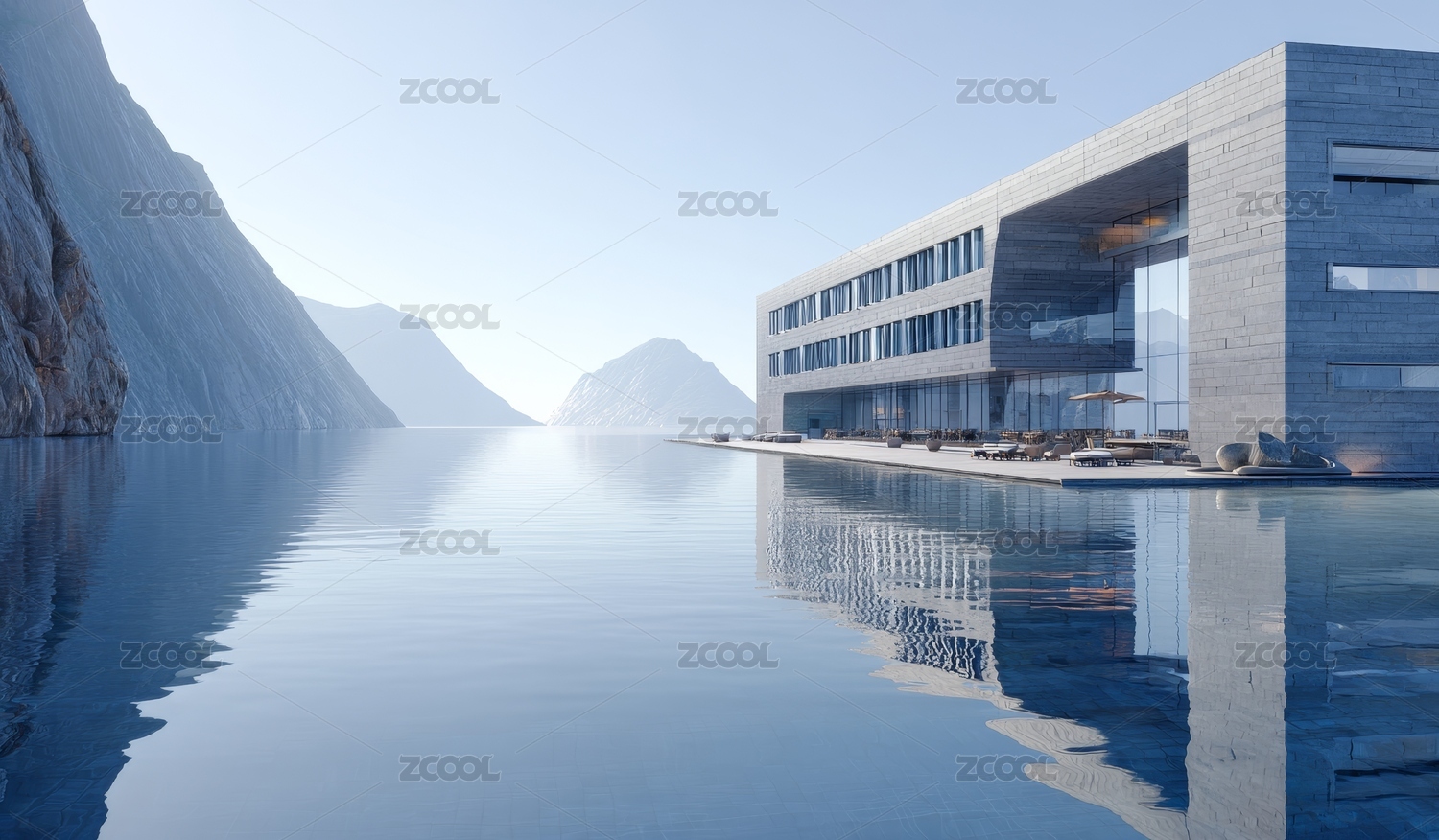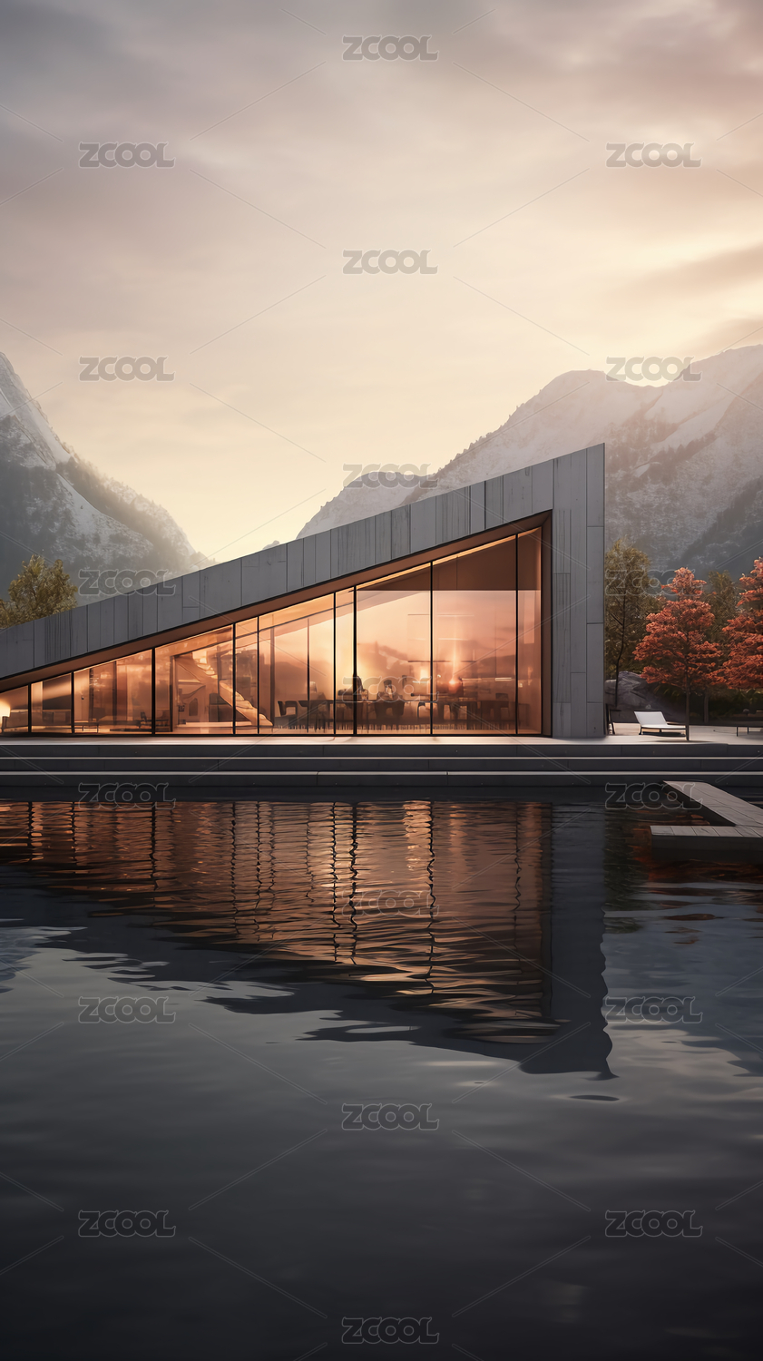 安静水面上的现代别墅风景
