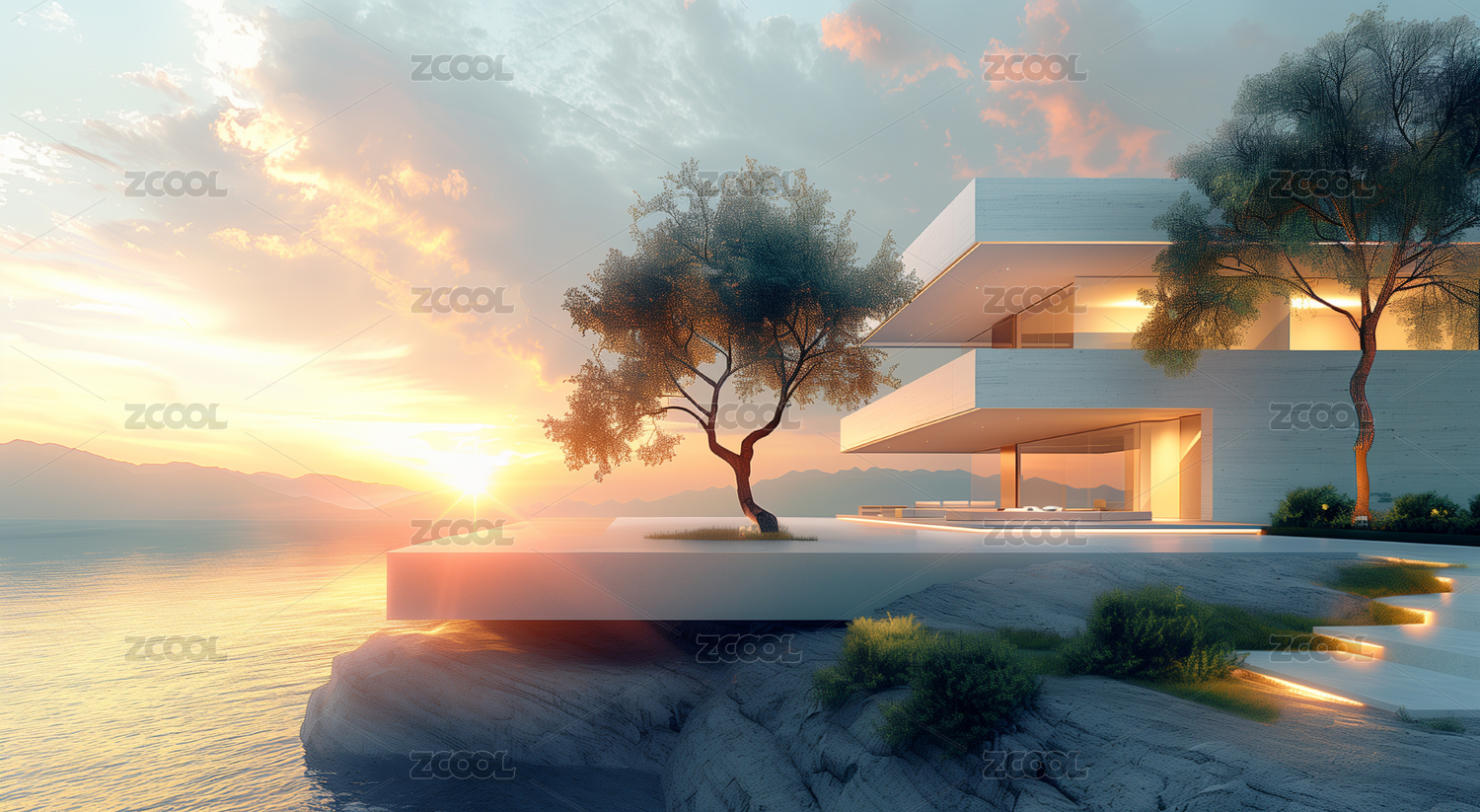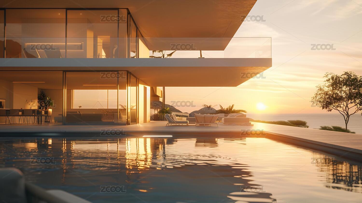 夕阳下的别墅海边现代建筑内部景观无边泳池