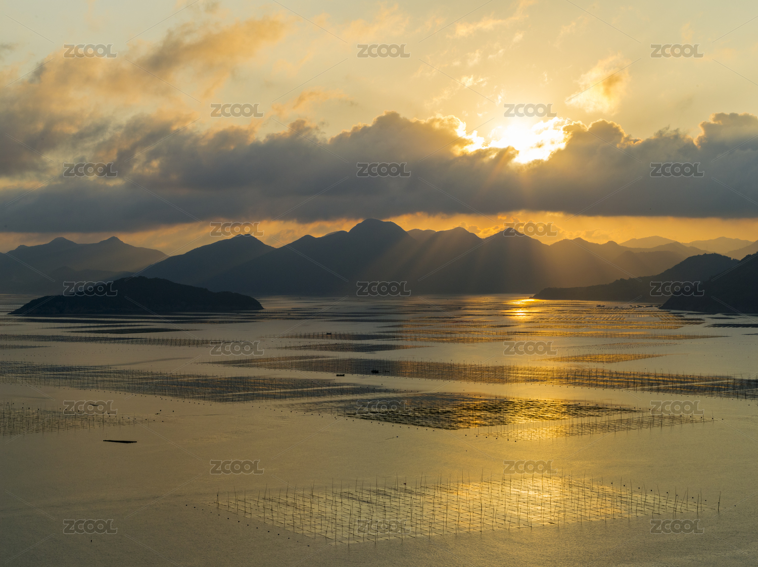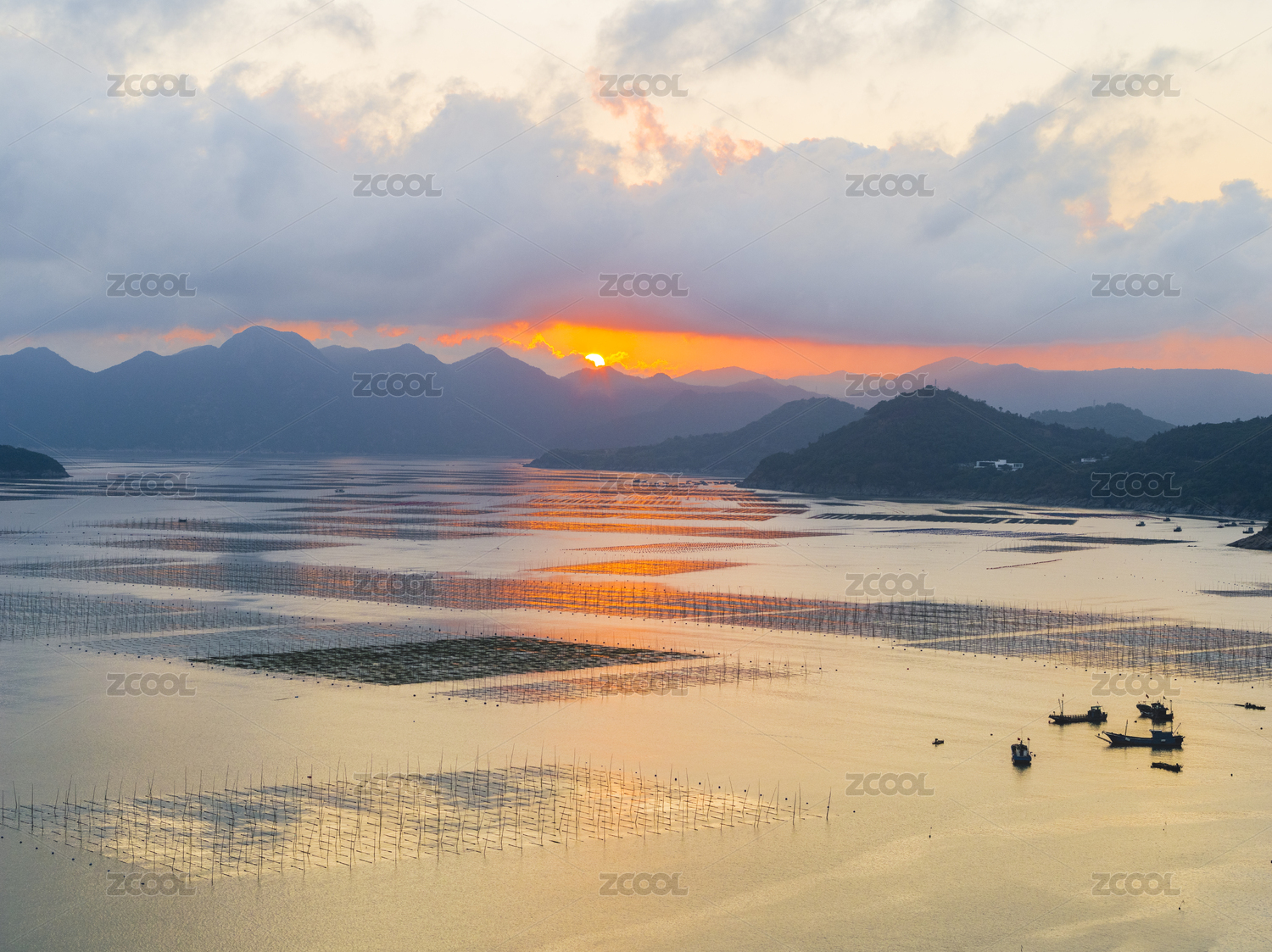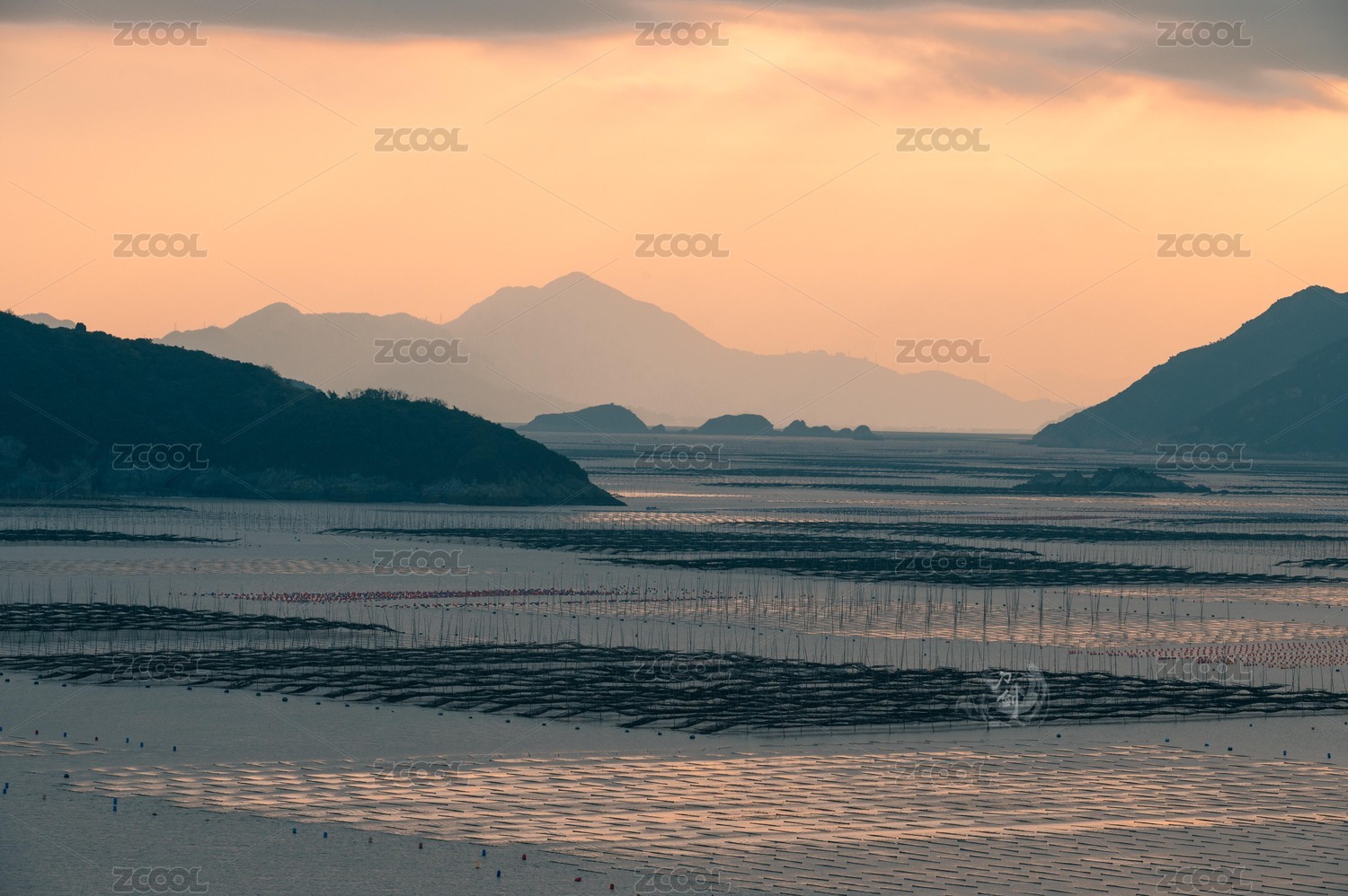 福建霞浦海洋养殖场日落风景