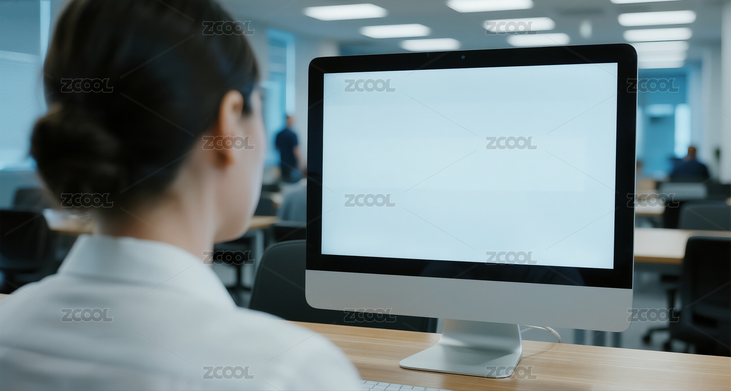 女士在办公室的木桌前面对空白屏幕的电脑工