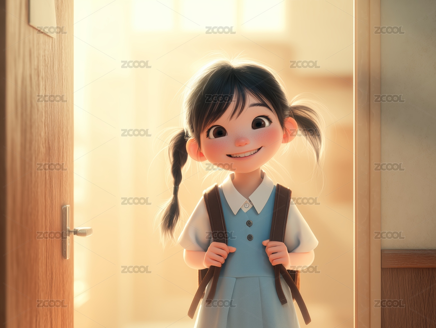 可爱女孩背着书包开学啦