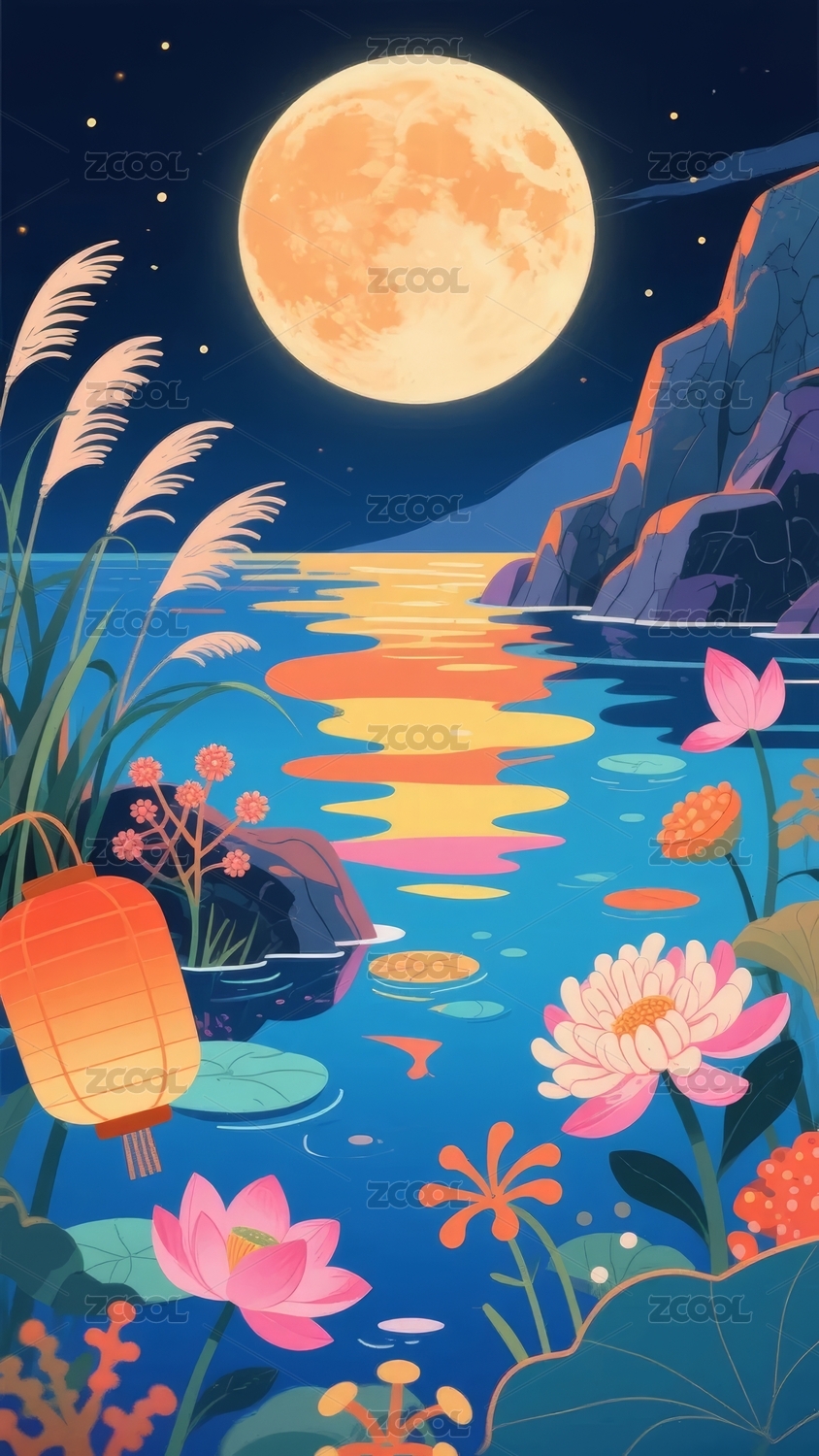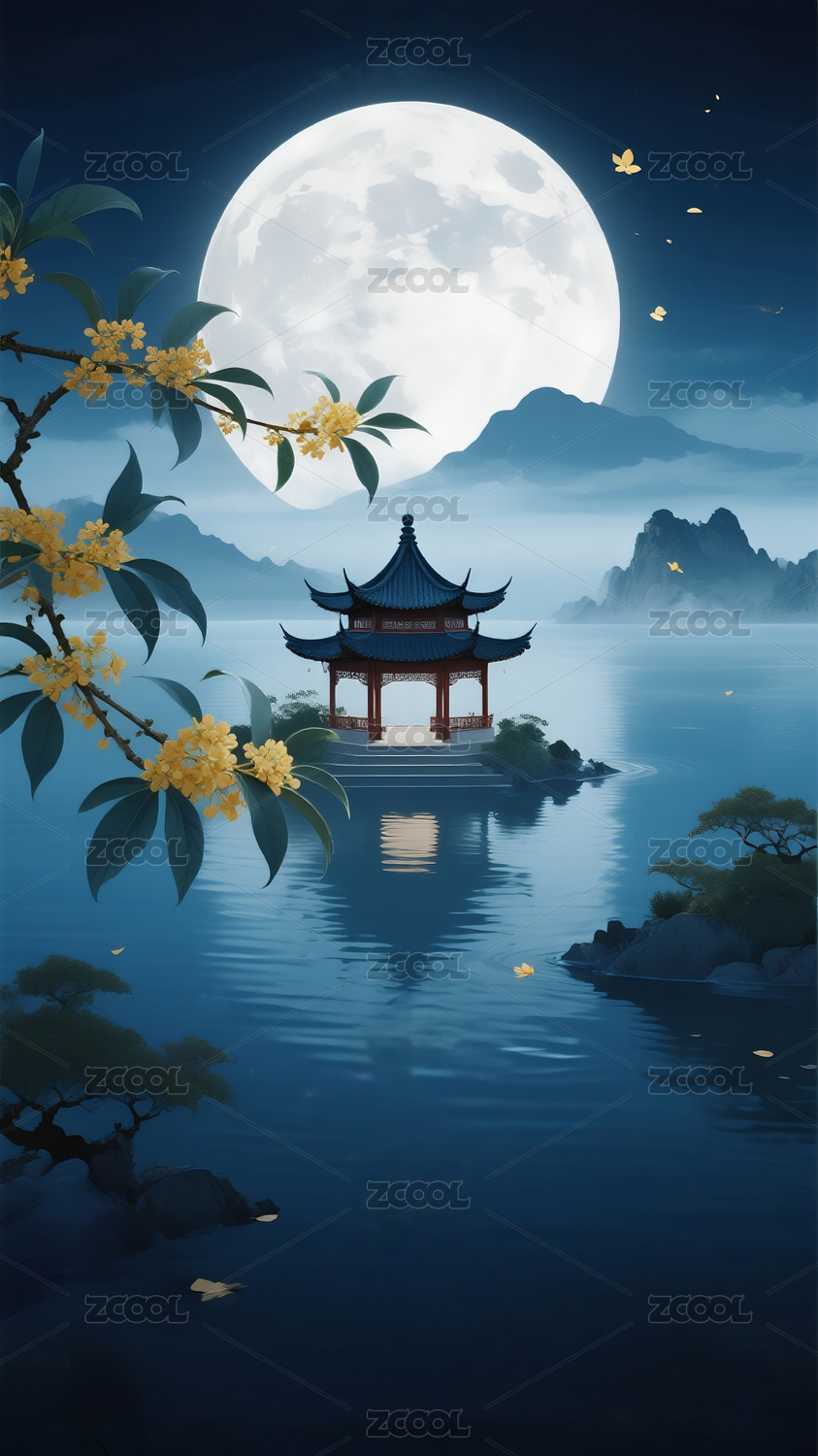 中国风,传统文化,山水画,月夜,唯美,梦幻,月光,浪漫,插画,背景