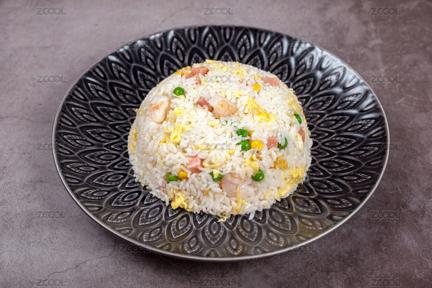 暗色水泥纹桌上放着一盘蛋炒饭
