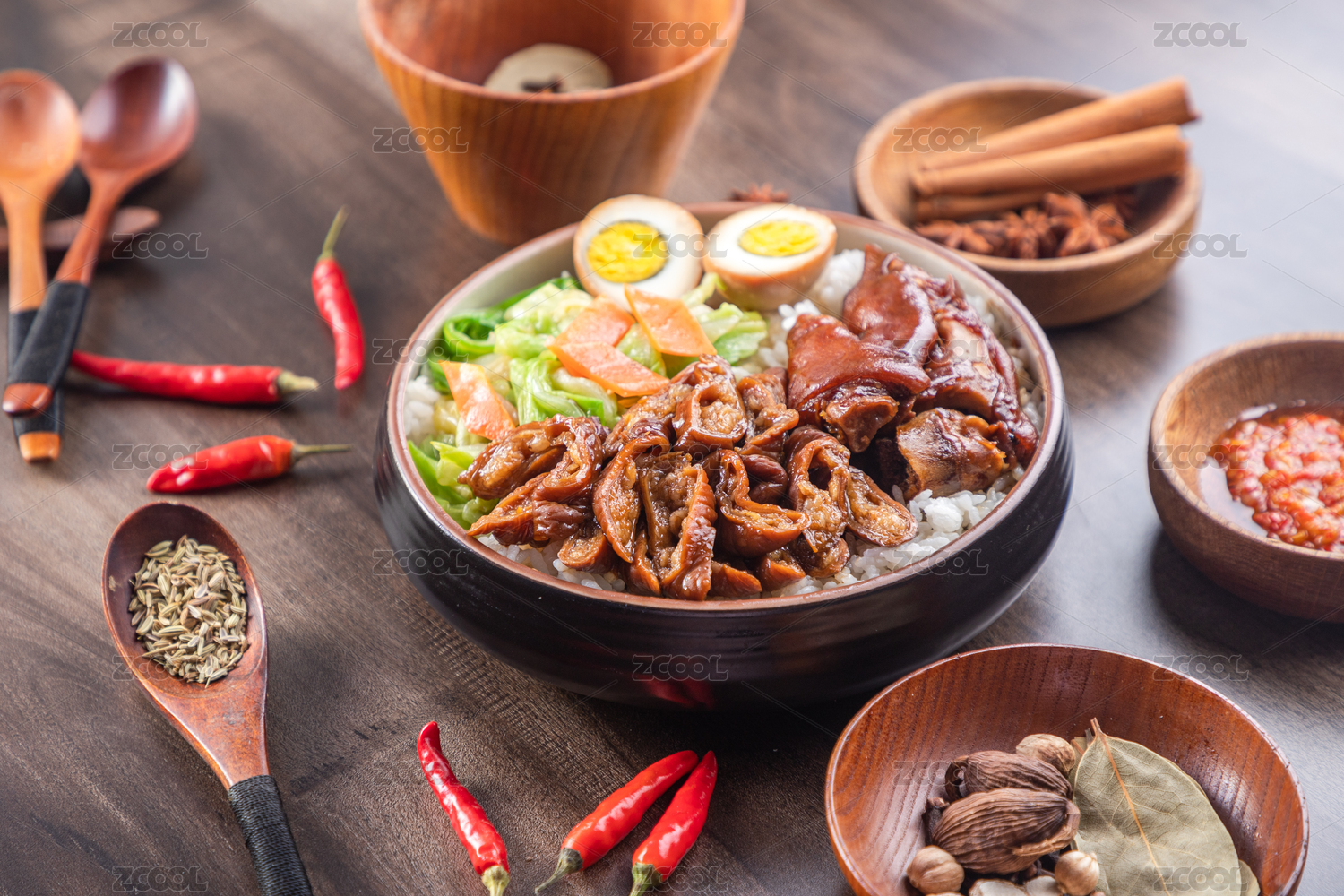 盖饭,卤肉,瓷碗,木纹桌,辣椒,木勺,孜然,木碗,大料,暗色调