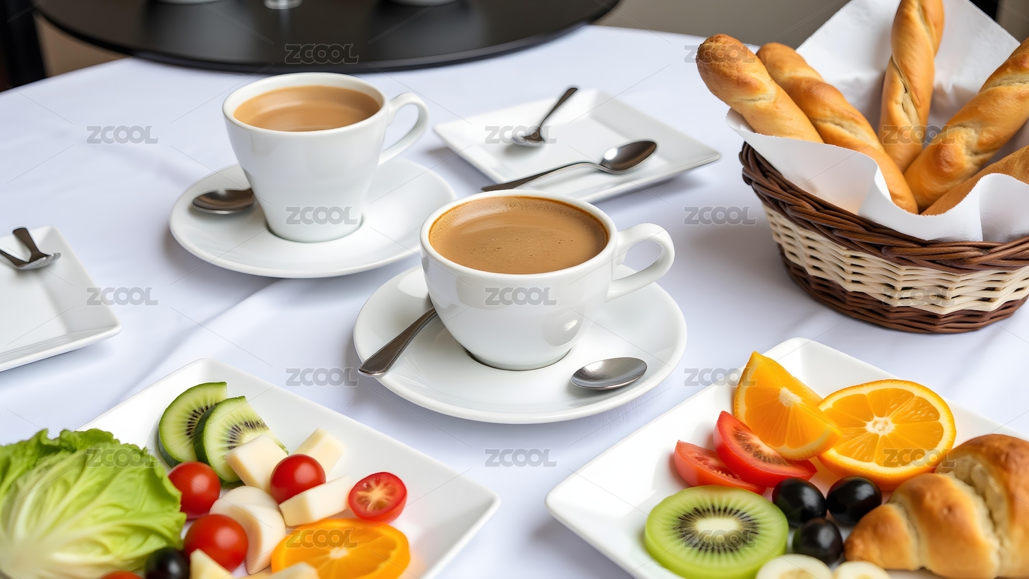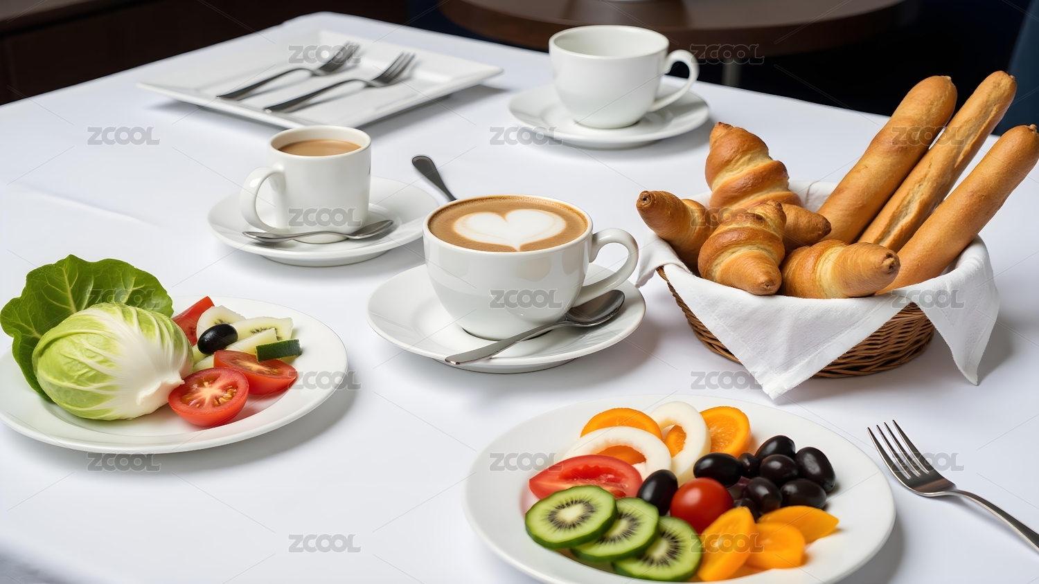 早餐,丰富,西式早餐,早餐场景,多种多样,煎蛋,可颂,水果,沙拉,咖啡