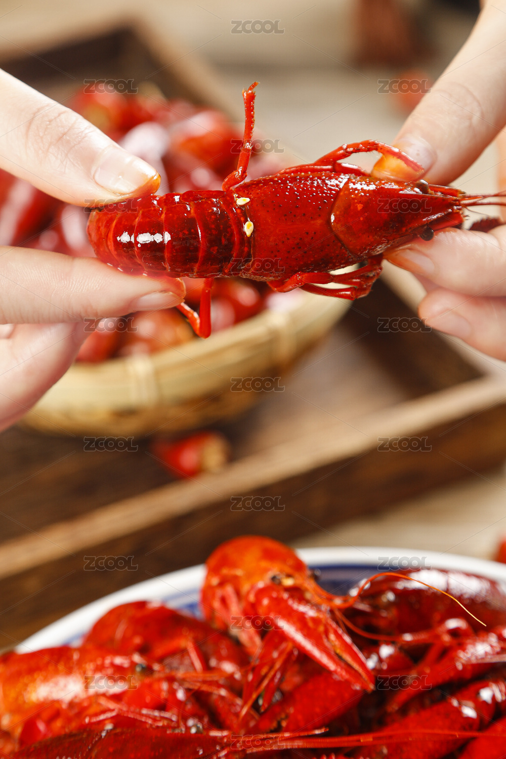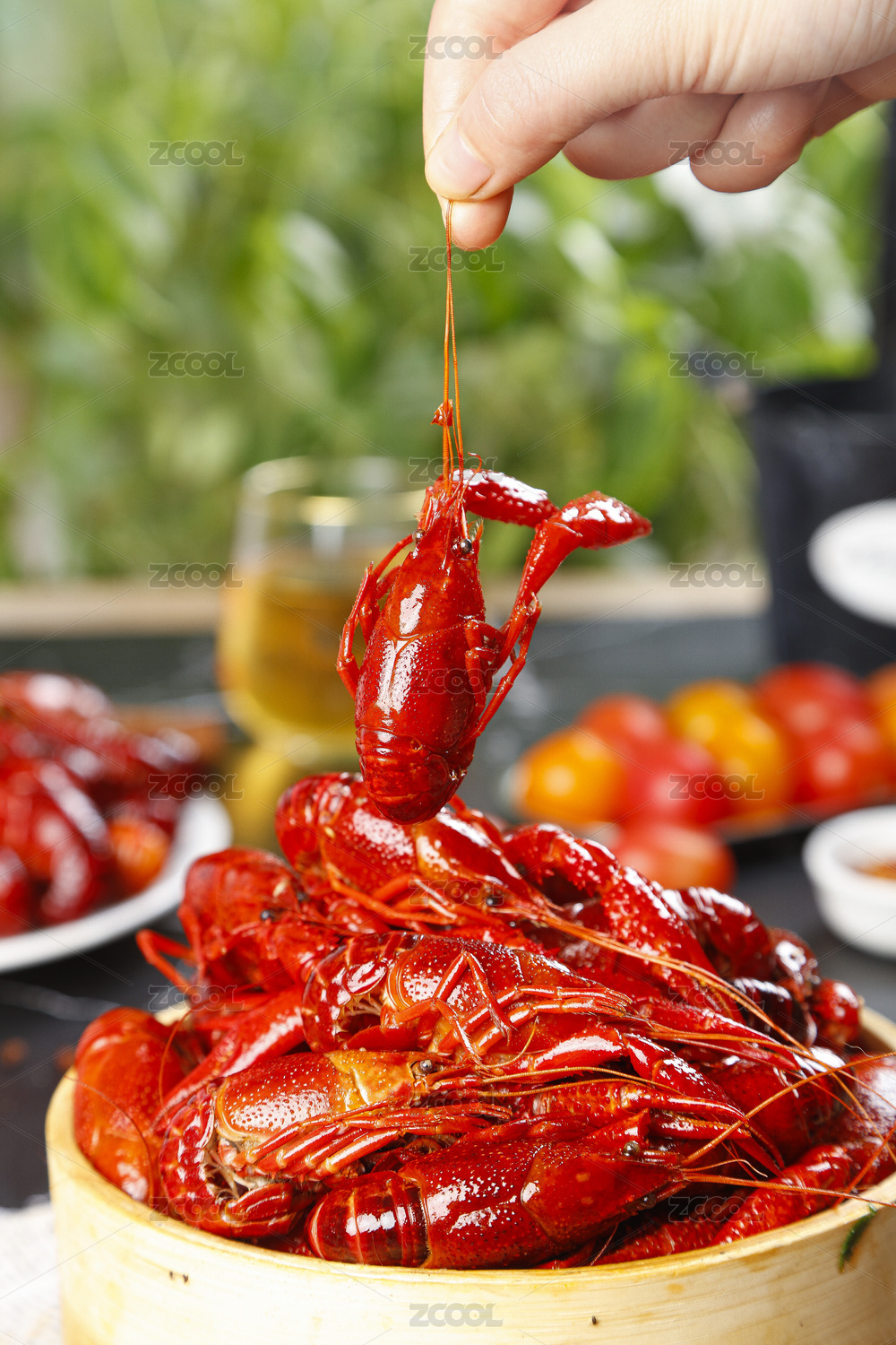 一笼十三香小龙虾和手上拿着一只去头的龙虾
