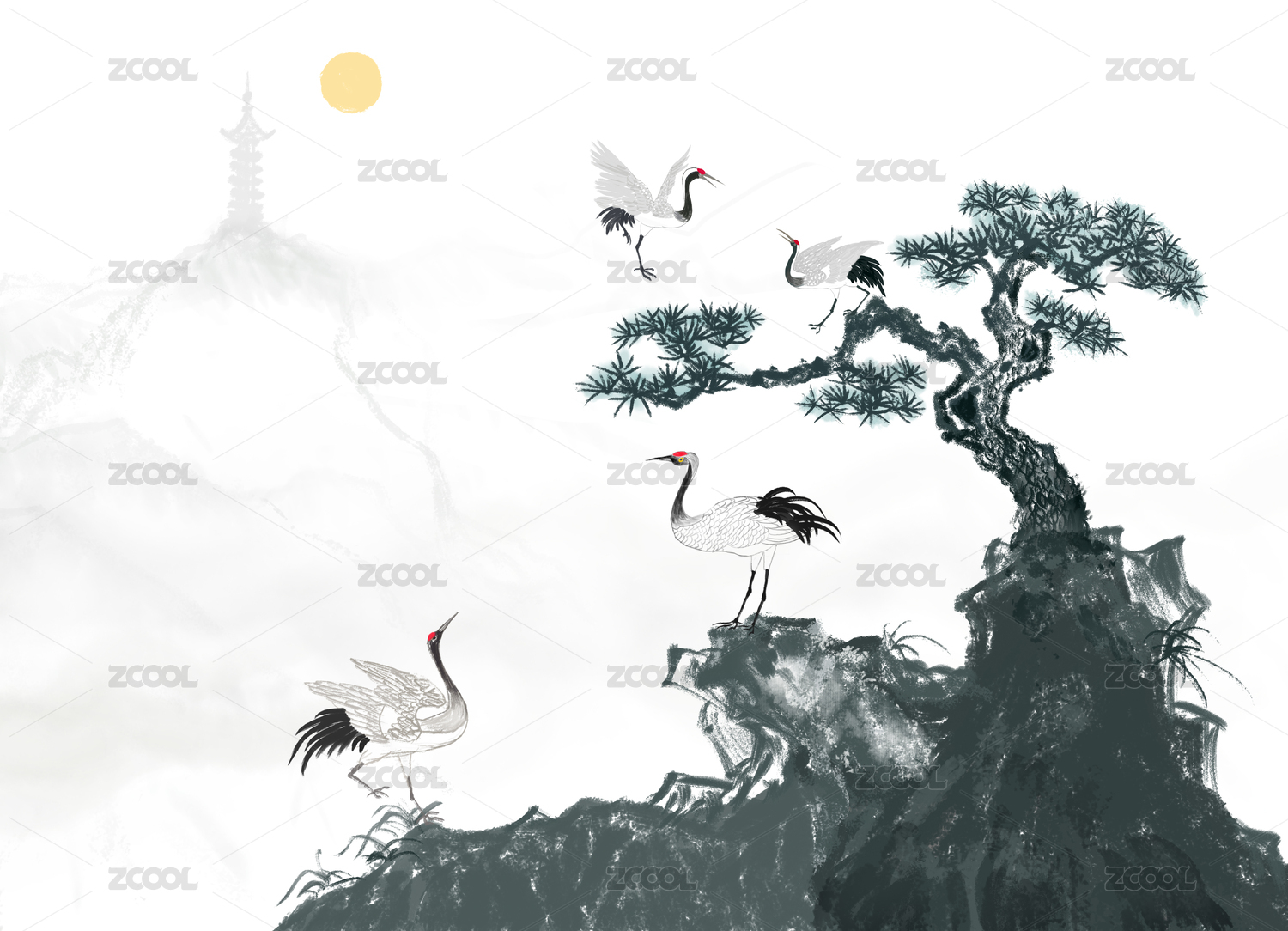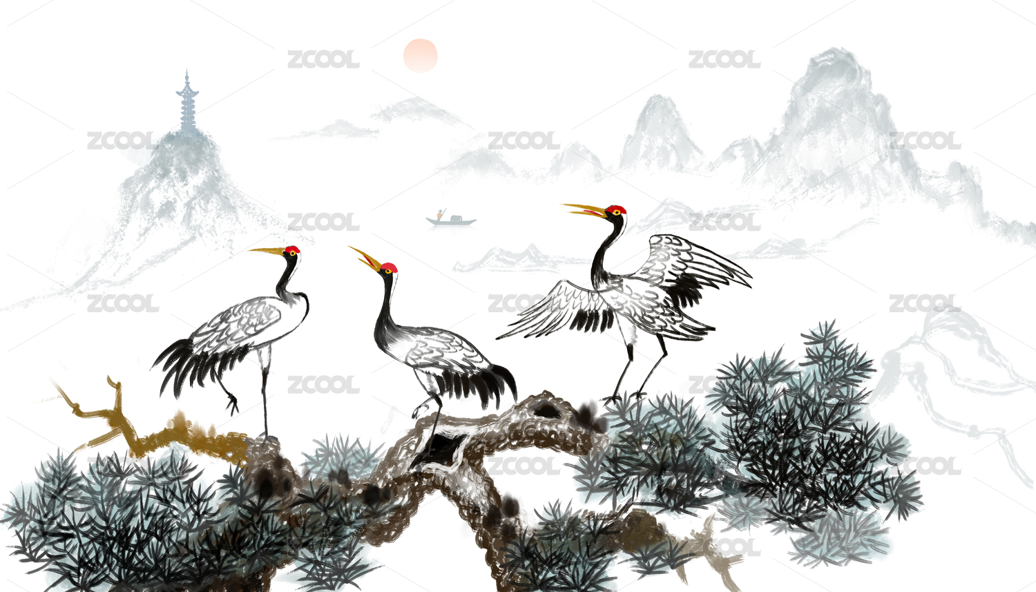 中堂画,仙鹤,松树,花鸟,国画,古松,远山,山川,水墨画,山水画