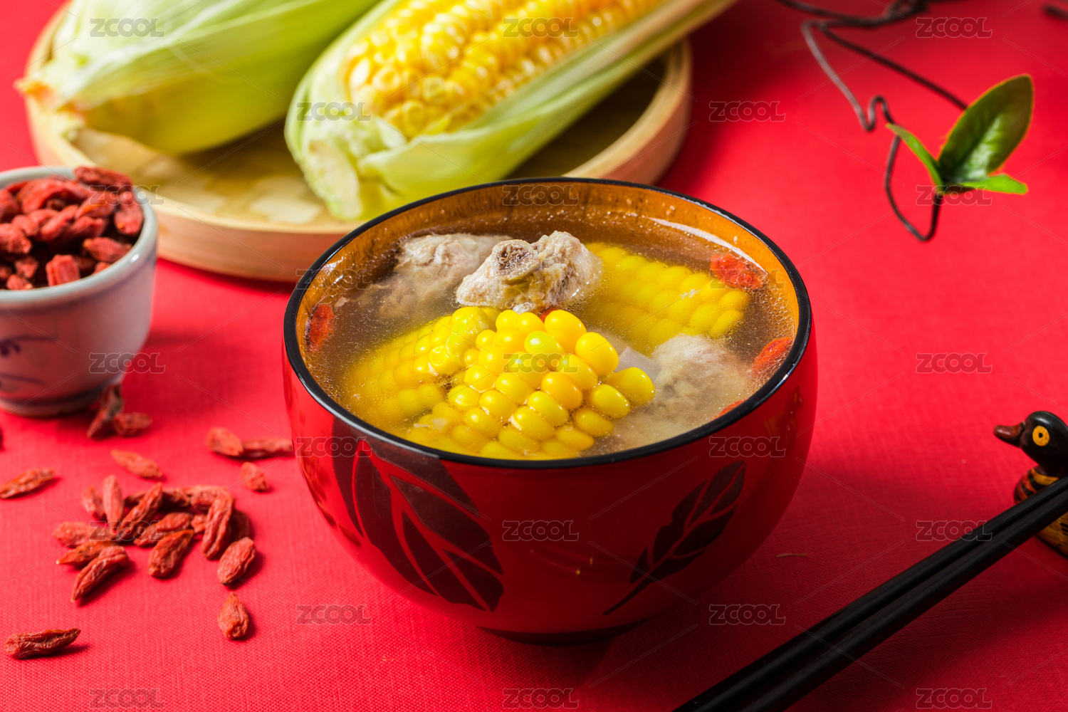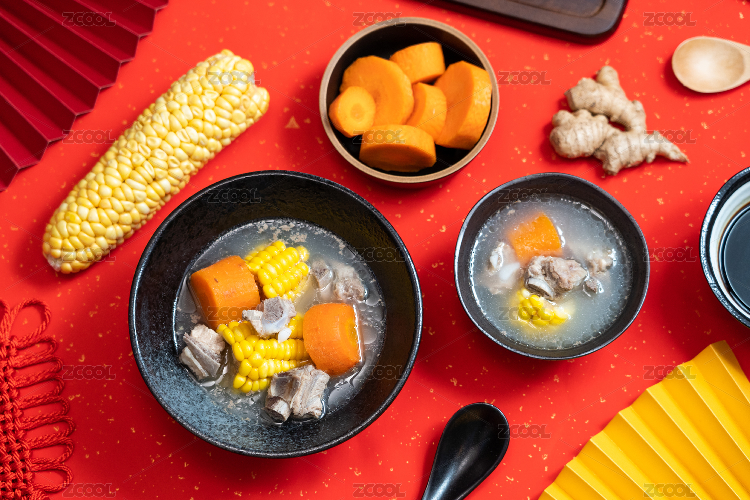 喜庆的红色背景上的排骨汤和旁边的配料