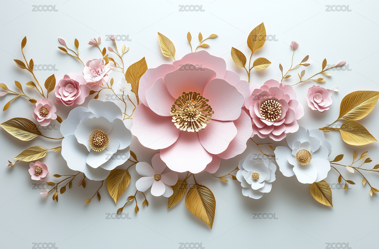 花朵和金色叶子立体插画