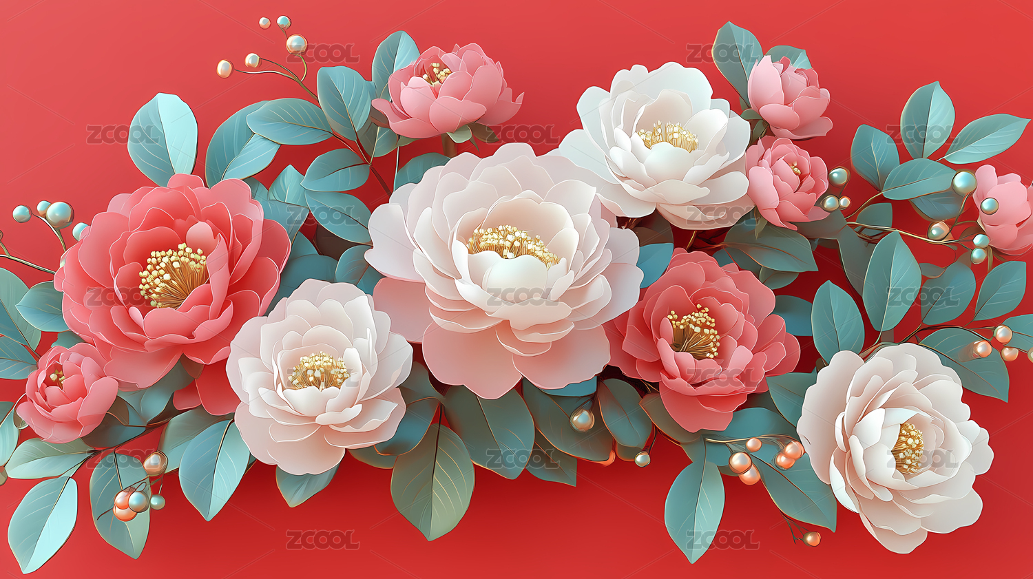 红色背景金色牡丹花