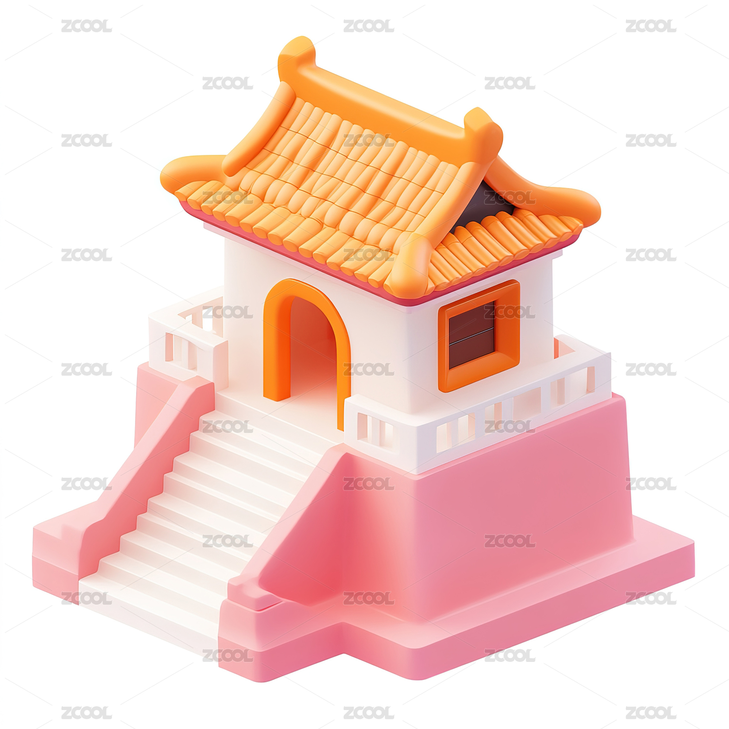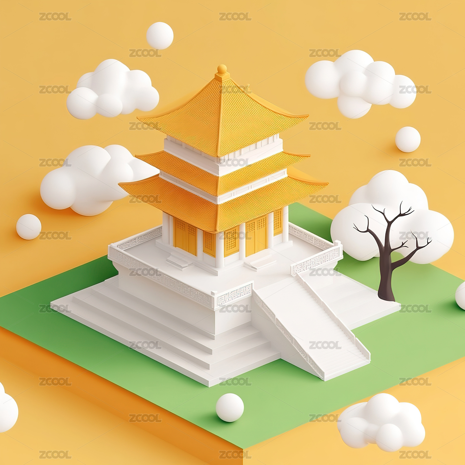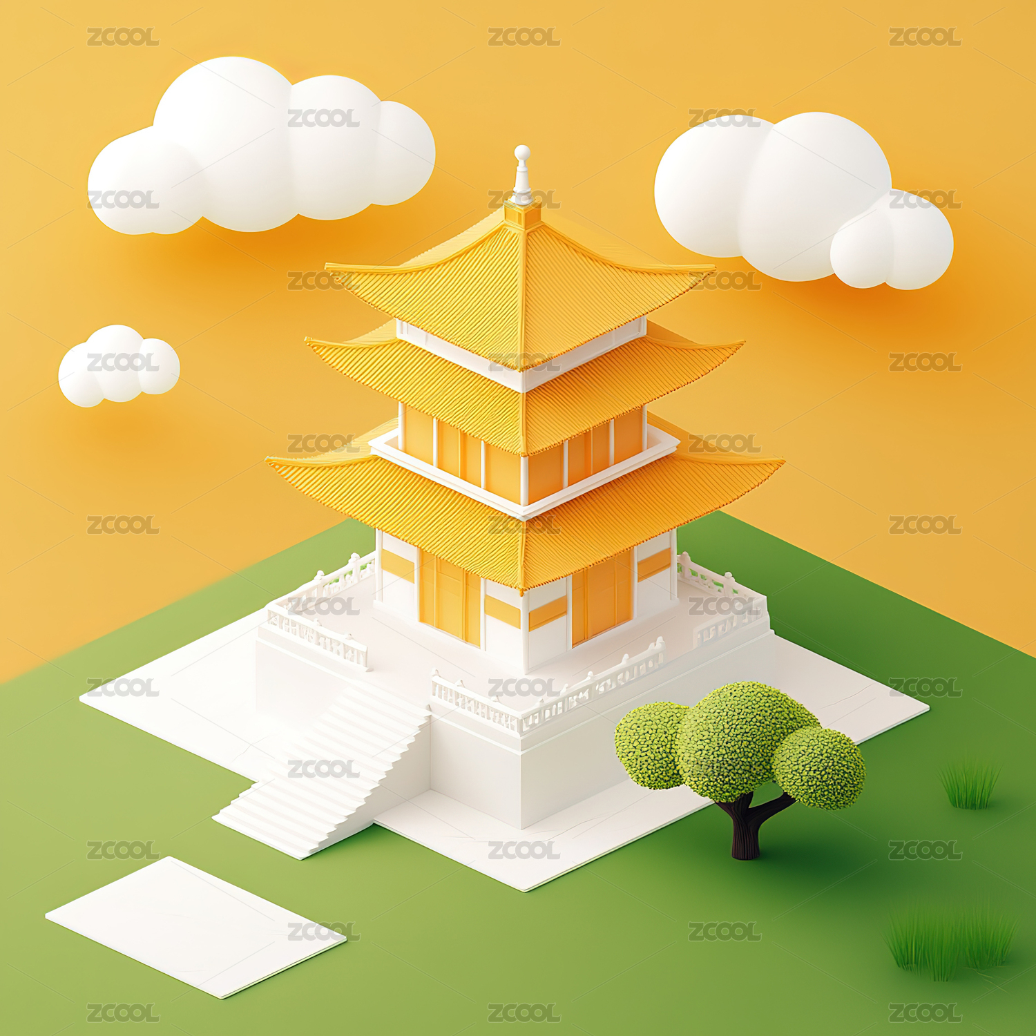 3D渲染中国风古建筑琉璃材质中式阁楼元素