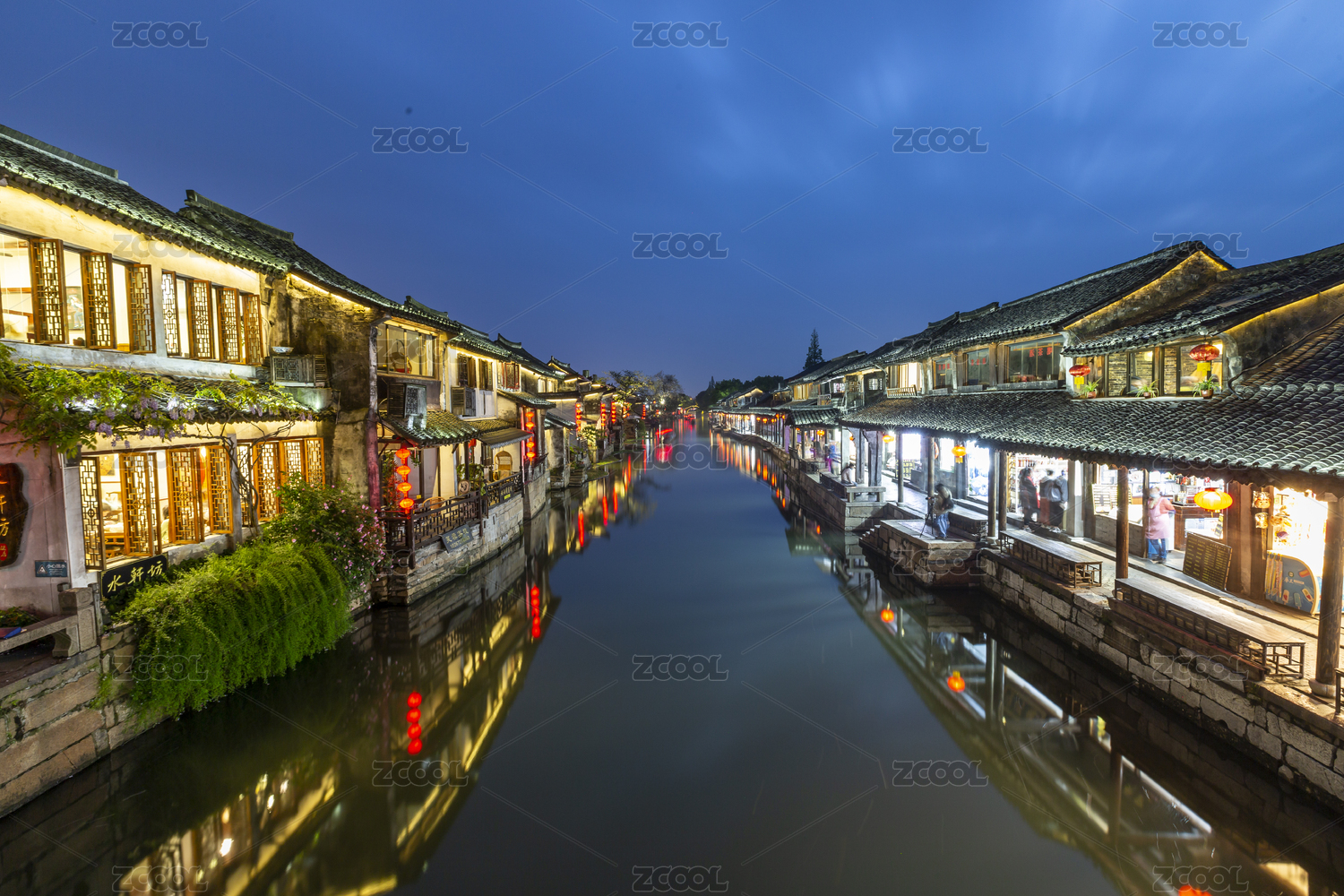 中国江苏省苏州市山塘街(中国历史文化名街)传统水乡之夜景。
