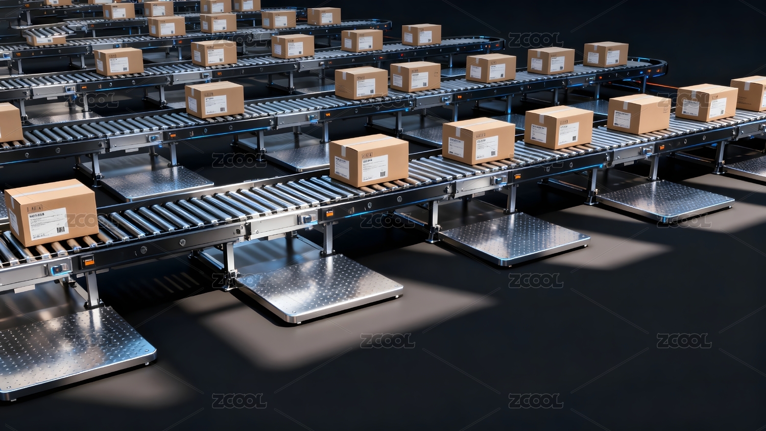 快递包裹在传输带上运输,网上购物,物流自动化管理理念。