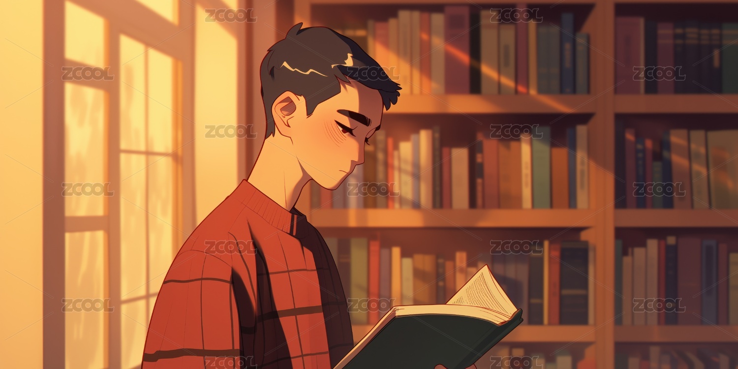 明亮图书馆书架前的亚洲男孩日漫绘画插画