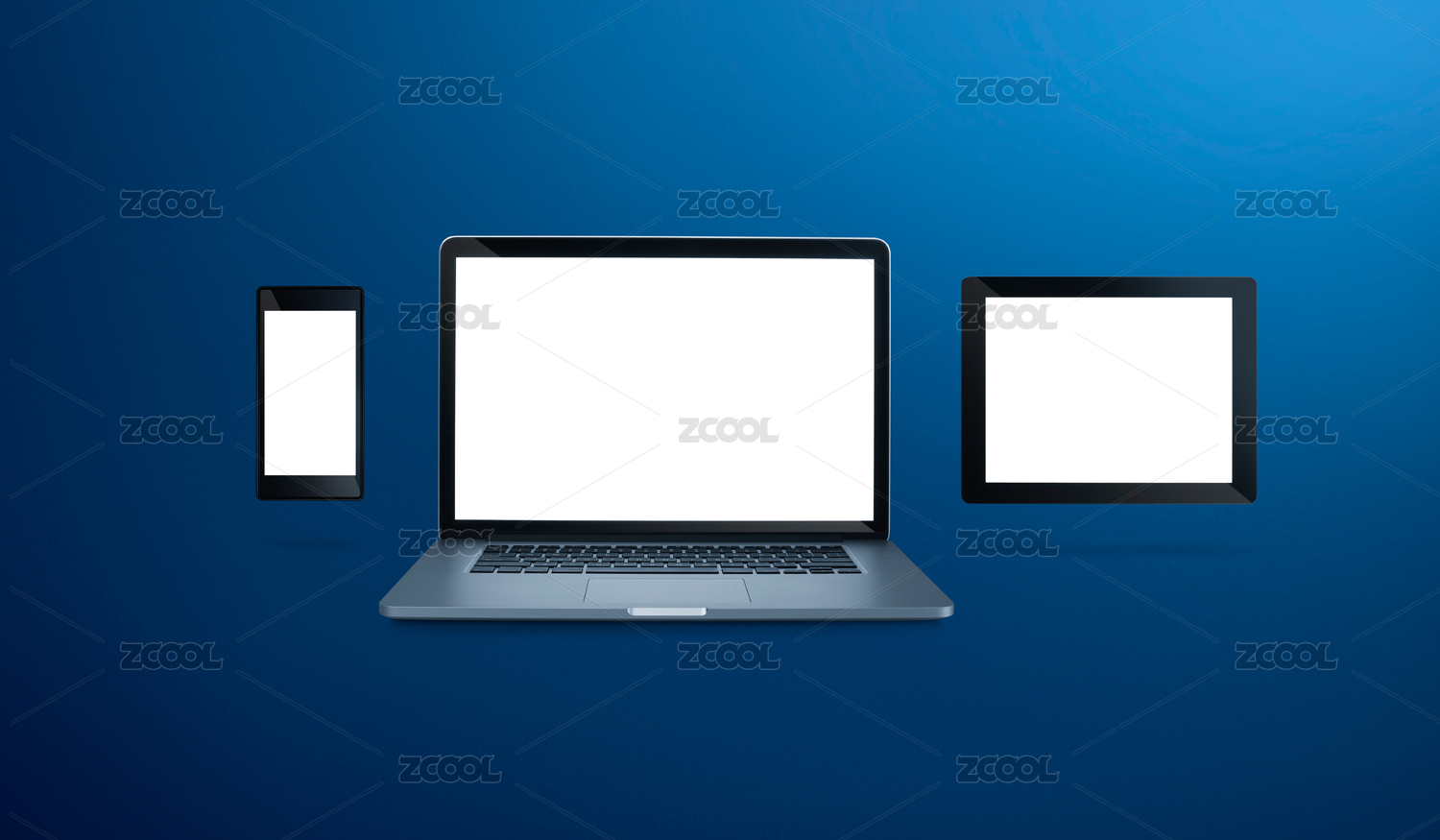 行动笔记本,电脑还有手机和白色空白屏幕在蓝色背景