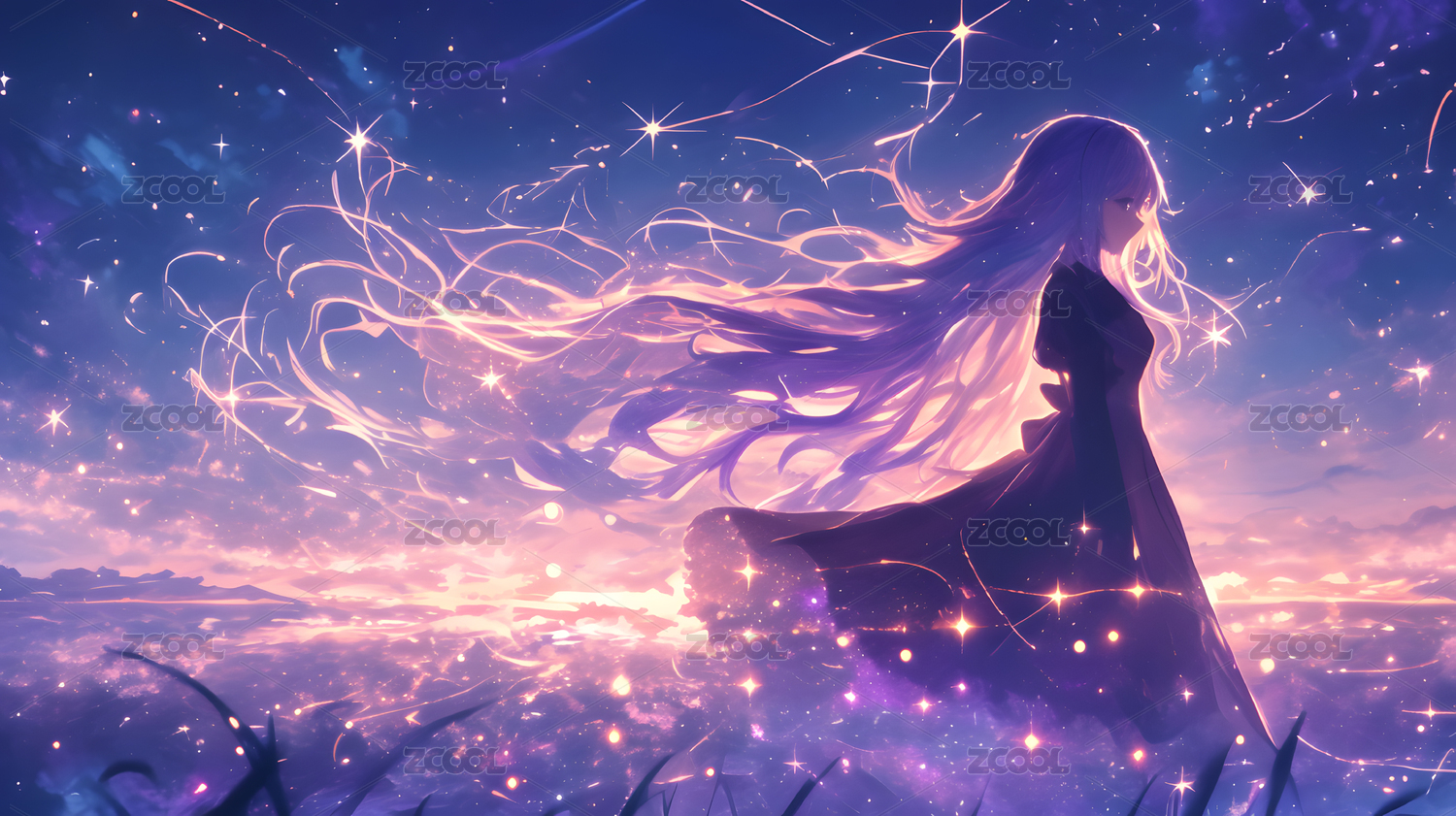 二次元,插画,少女,梦幻,金色,星空,宇宙,紫色,长发,光