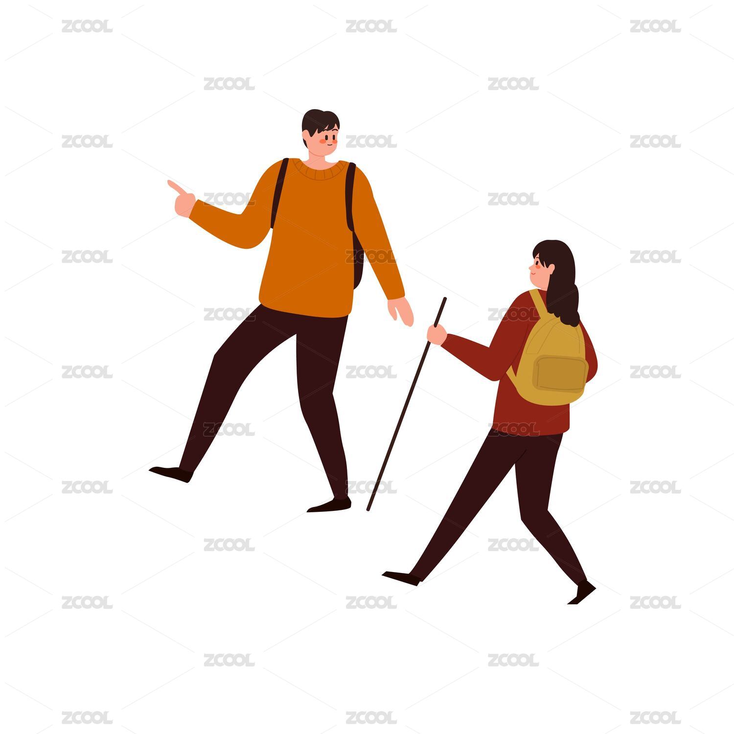 卡通手绘两个人旅游奔跑插画