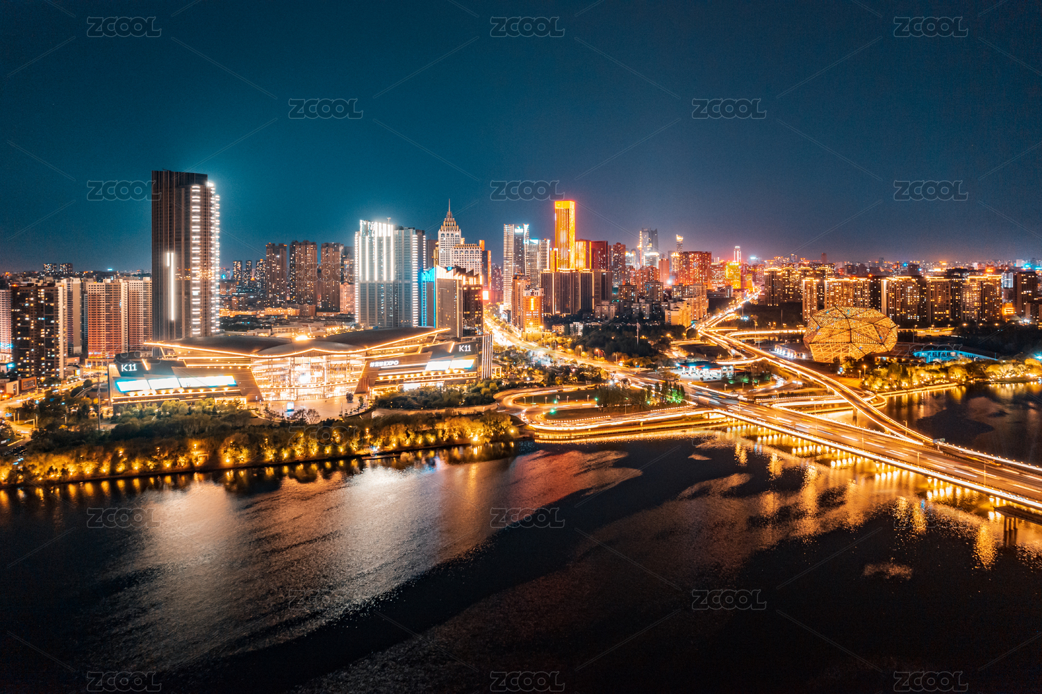 中国辽宁沈阳浑河岸边城市风光夜景航拍