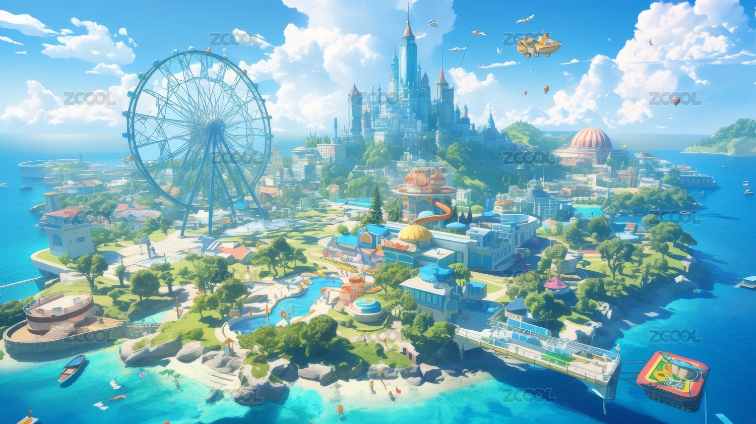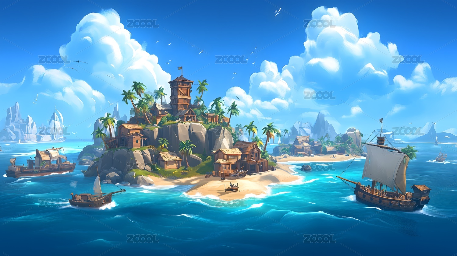热带岛屿鸟瞰图,山脉环绕,碧海蓝天