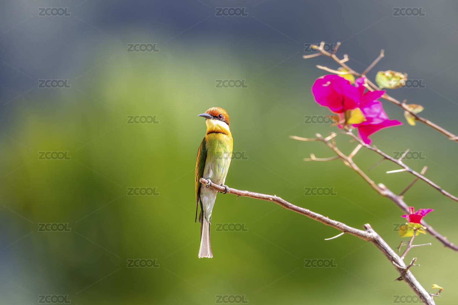 一只栗喉蜂虎鸟站立在枝头捕食蜜蜂蝴蝶昆虫