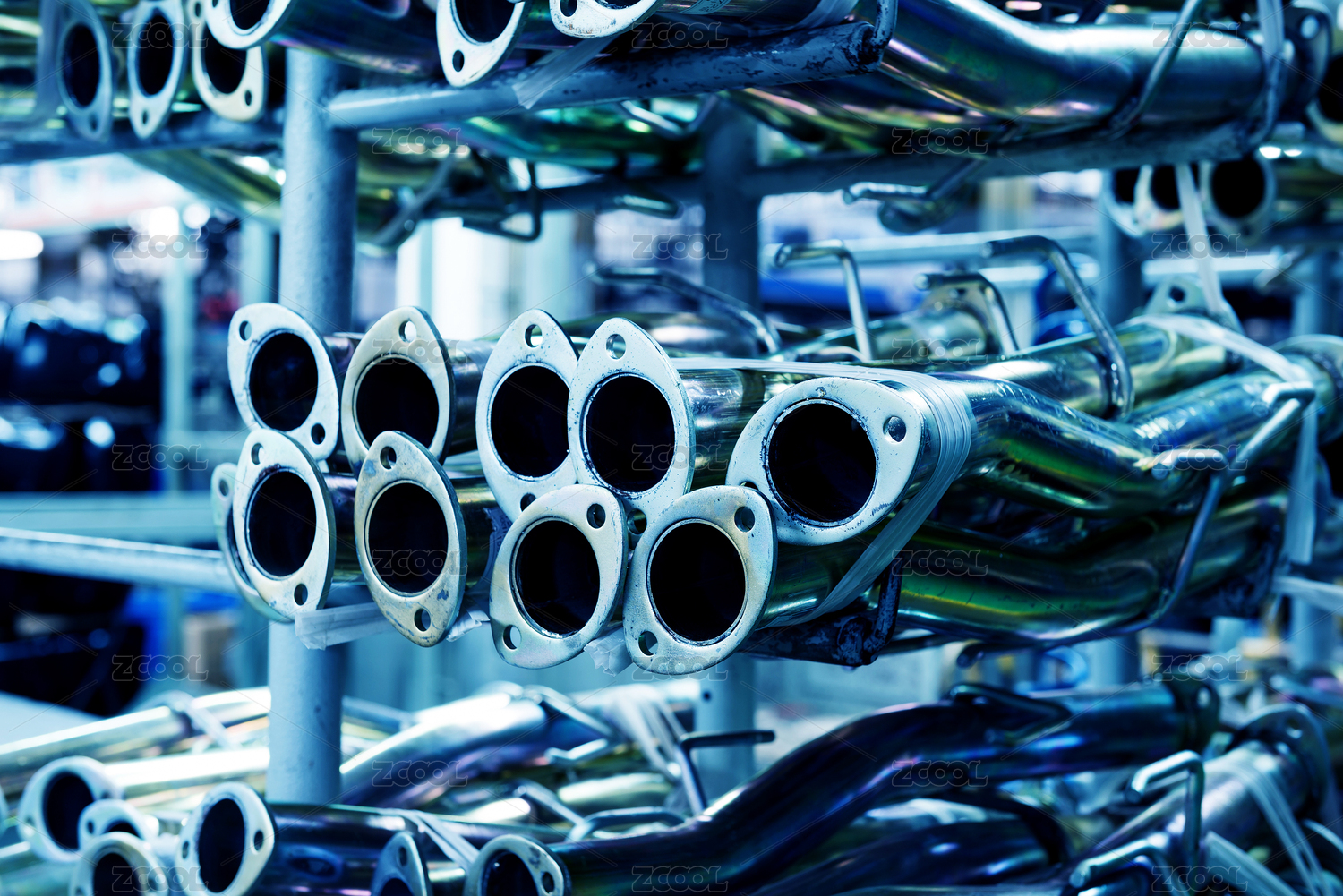 特写多根排列整齐的机械管道零件
