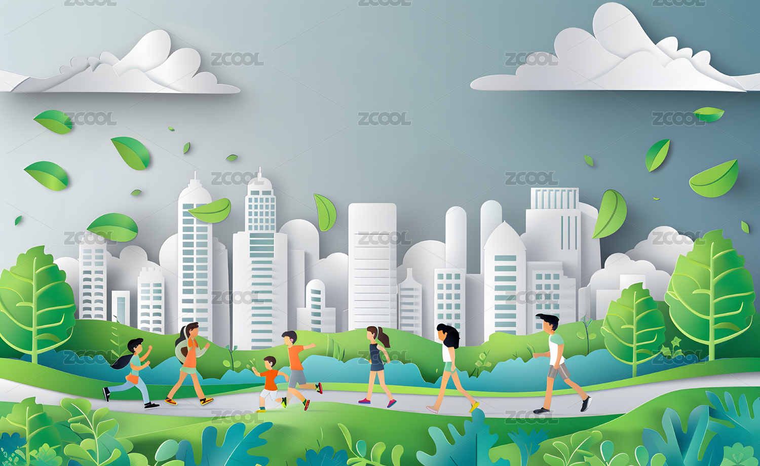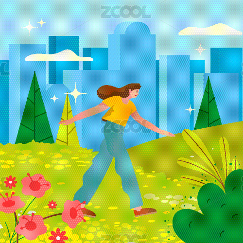 城市公园蓝天白云樱花踏青出游骑车运动矢量