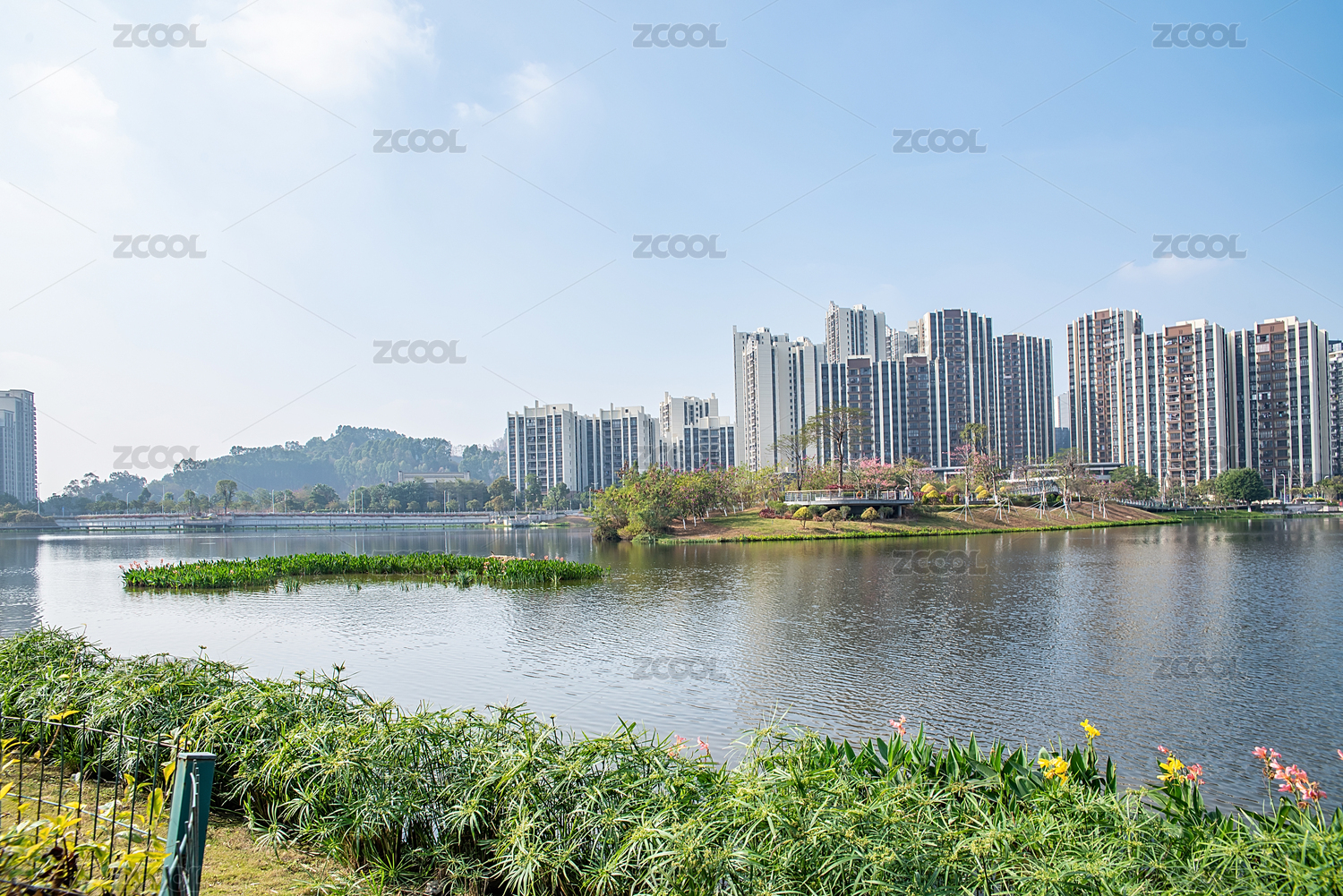 阳光下公园里的湖泊和远处拔地而起的商业楼盘建筑