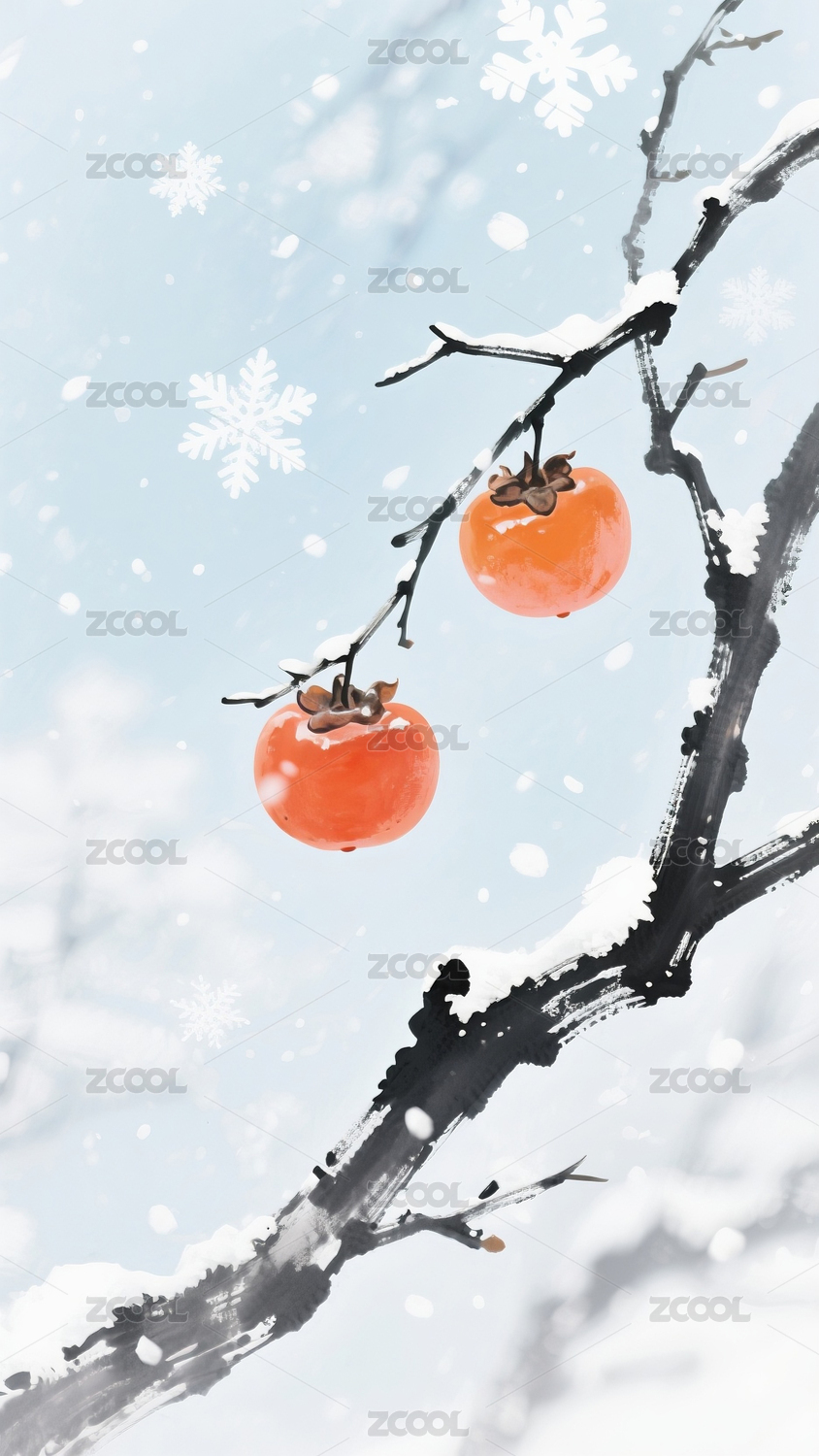 雪中柿子树枝