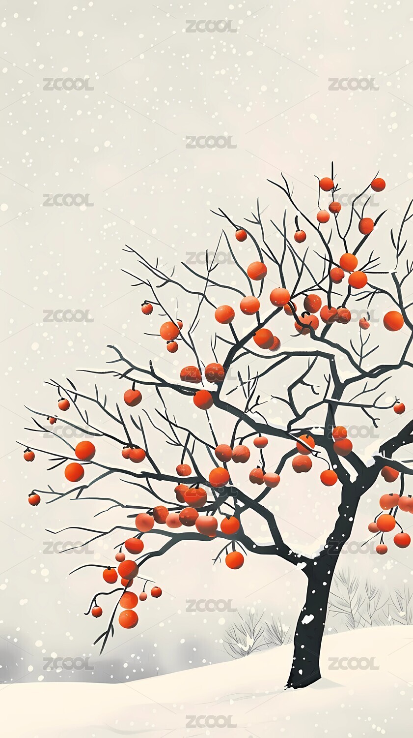 冬季积雪的柿子树果树特写插画