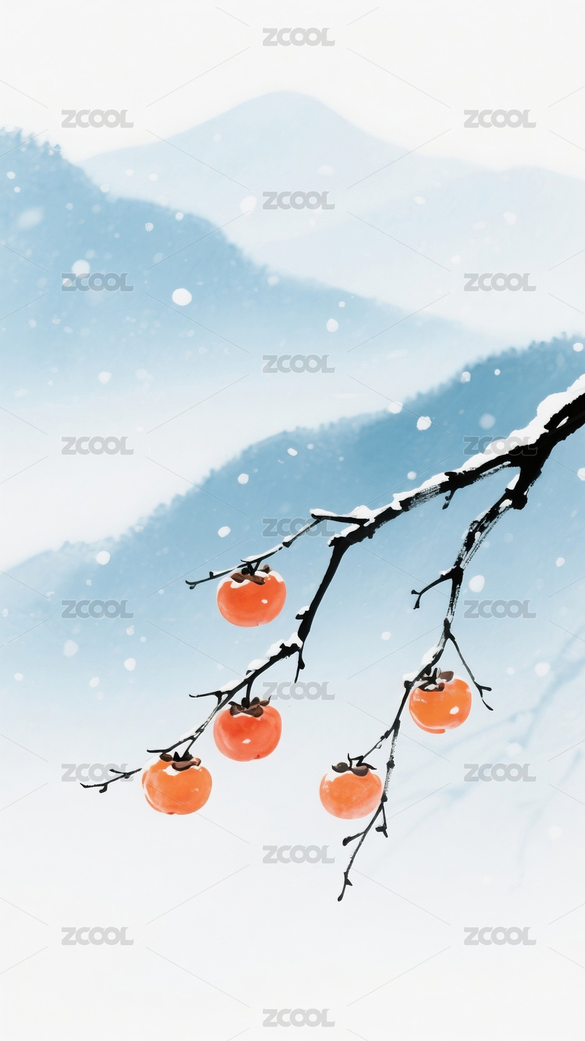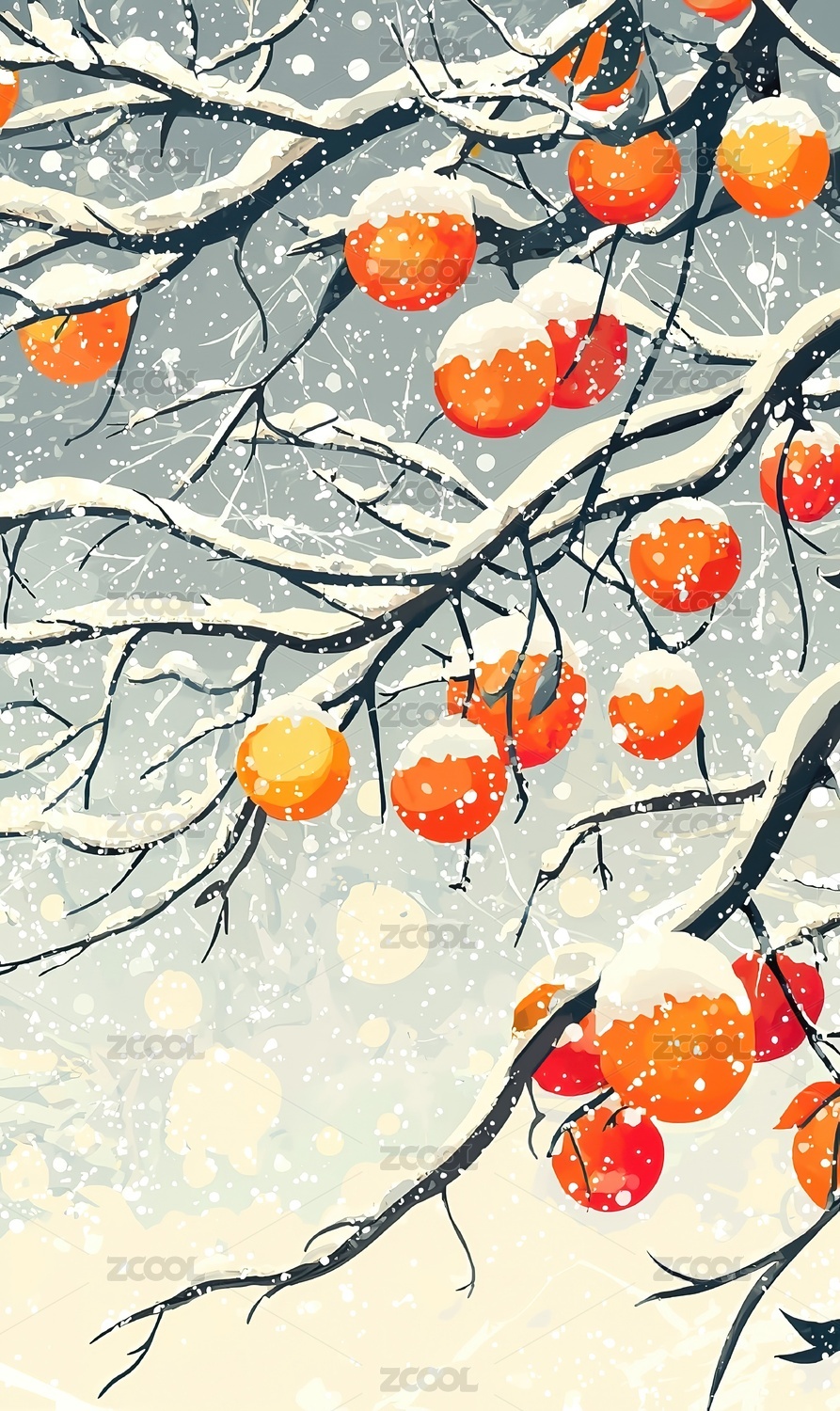 手绘柿子冬日下雪背景插画