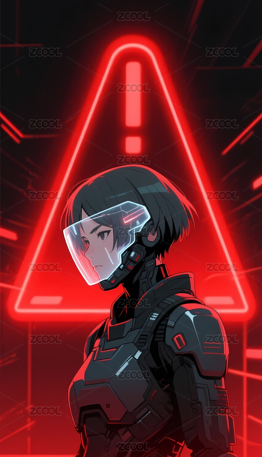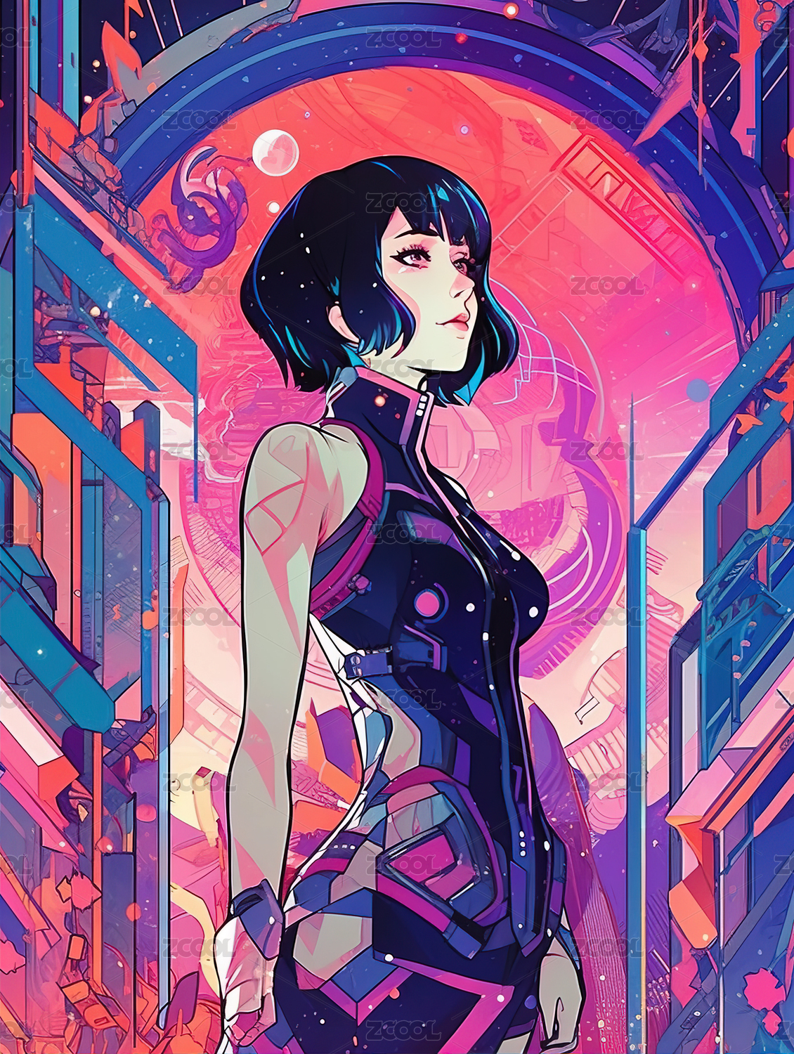 粉色短发红色眼睛机械科幻手绘美少女插画