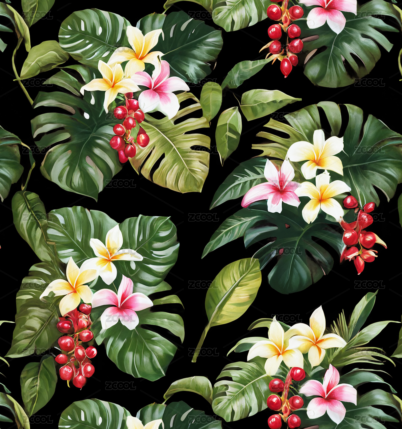 热带无缝叶子花卉小果子印花图案