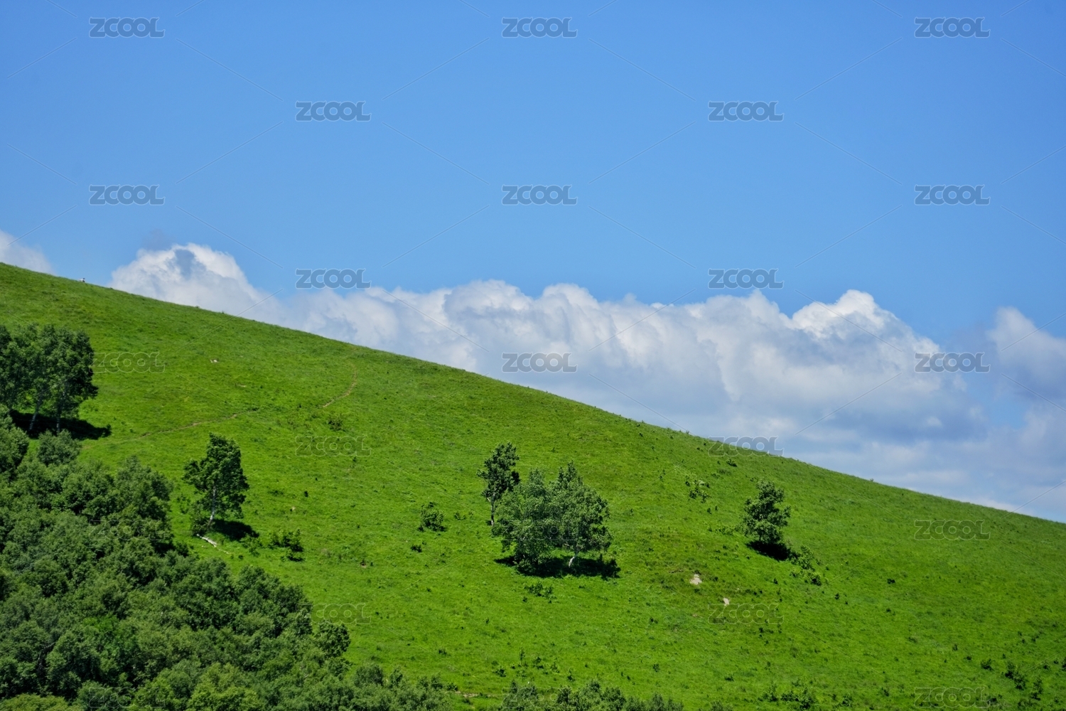 中国新疆夏季晴天蓝色天空下绿色的大草原
