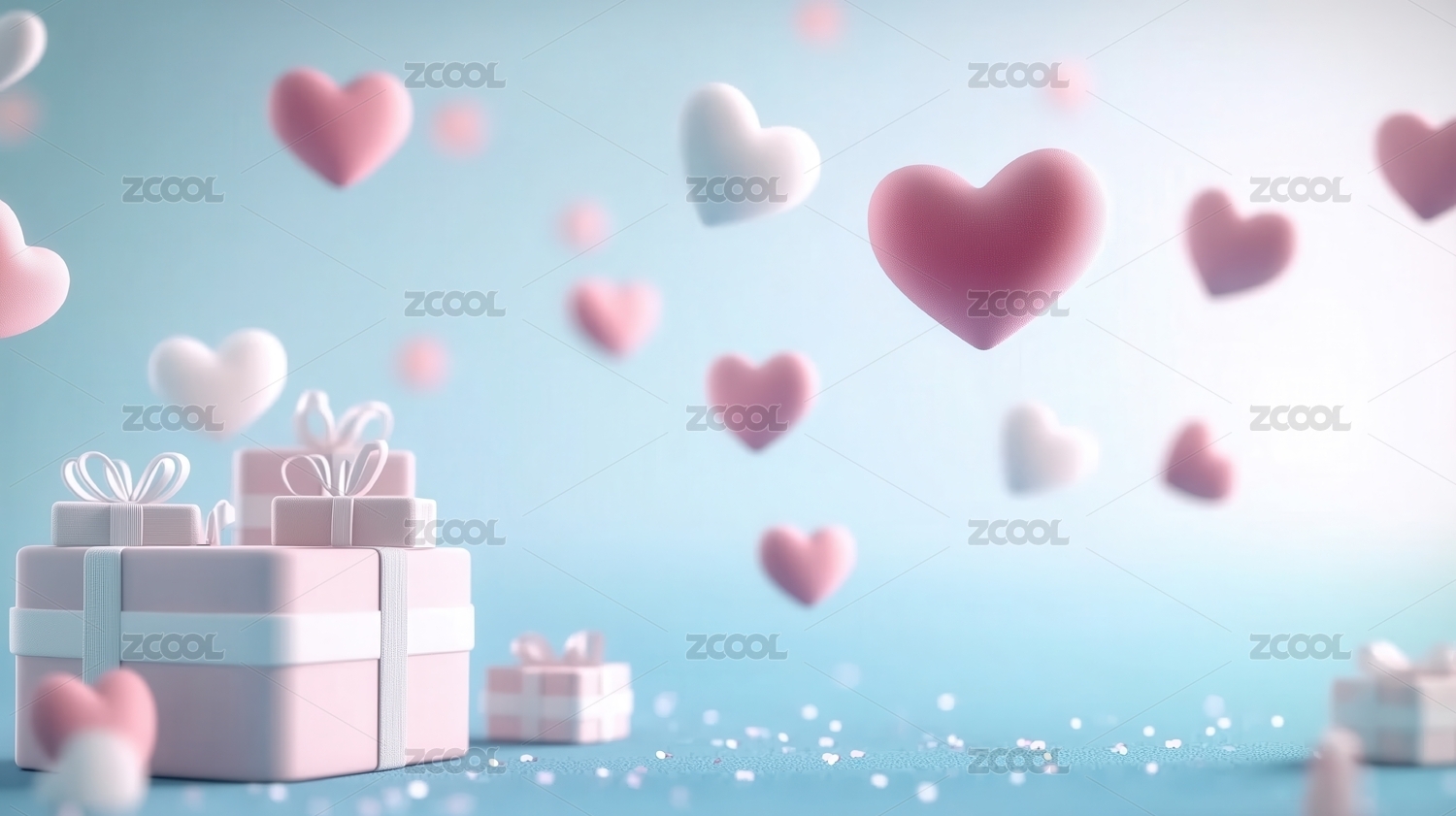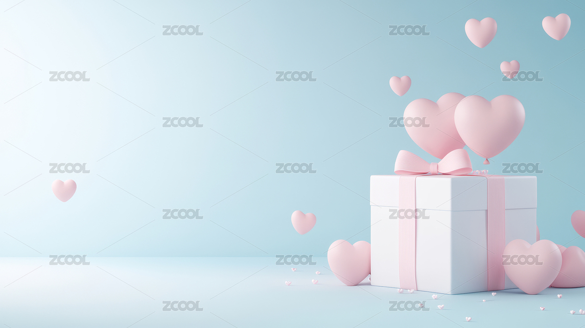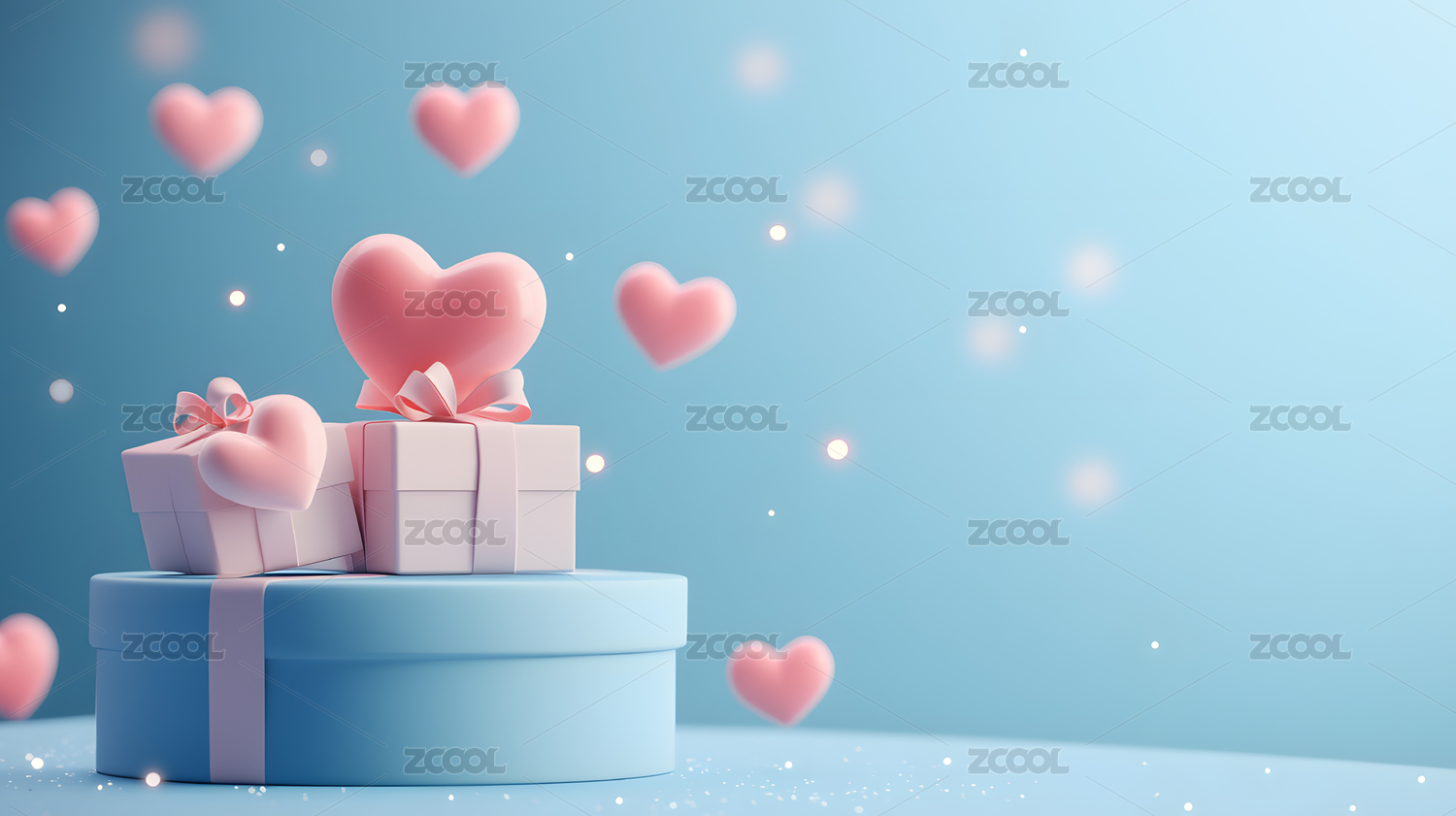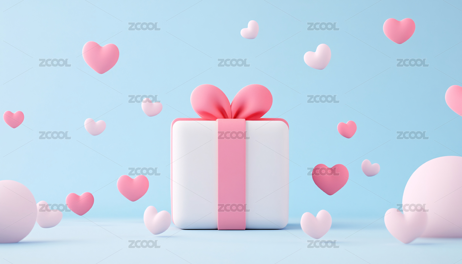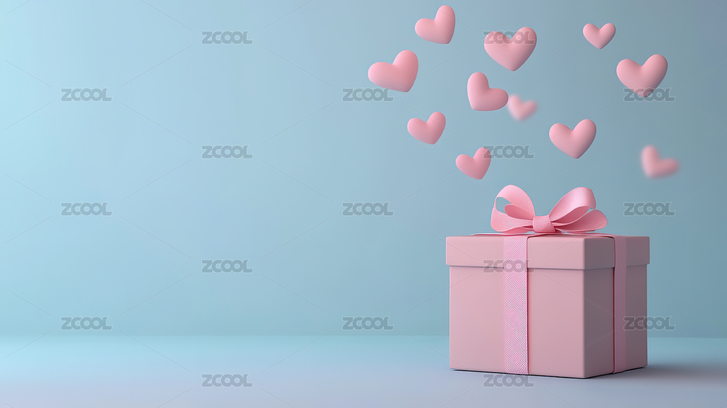 绑着丝带的礼品盒周围漂浮着粉色爱心