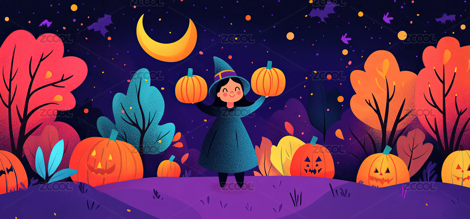 卡通万圣节派对节日南瓜灯魔法女巫插画海报