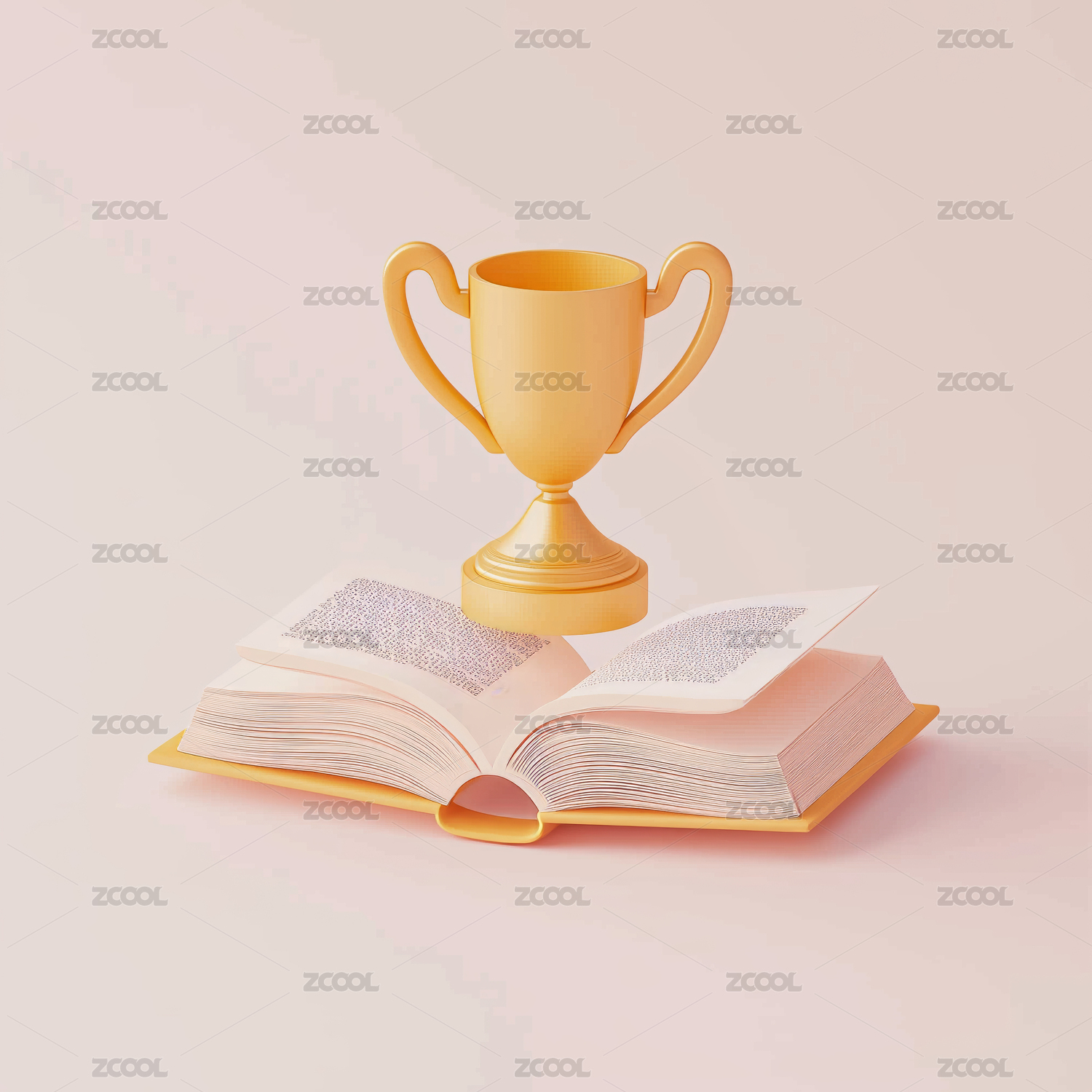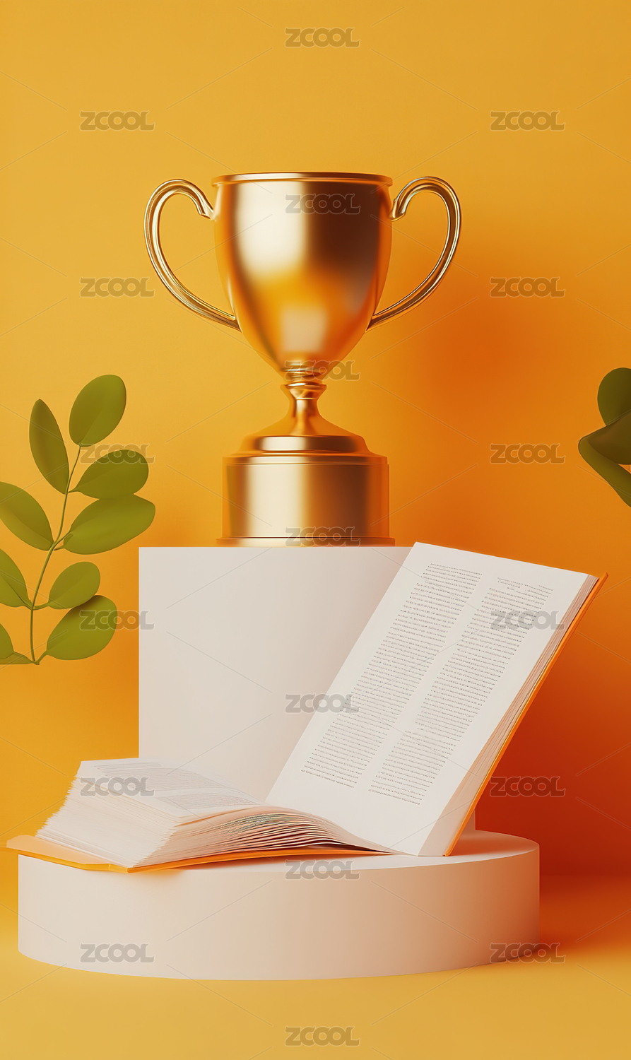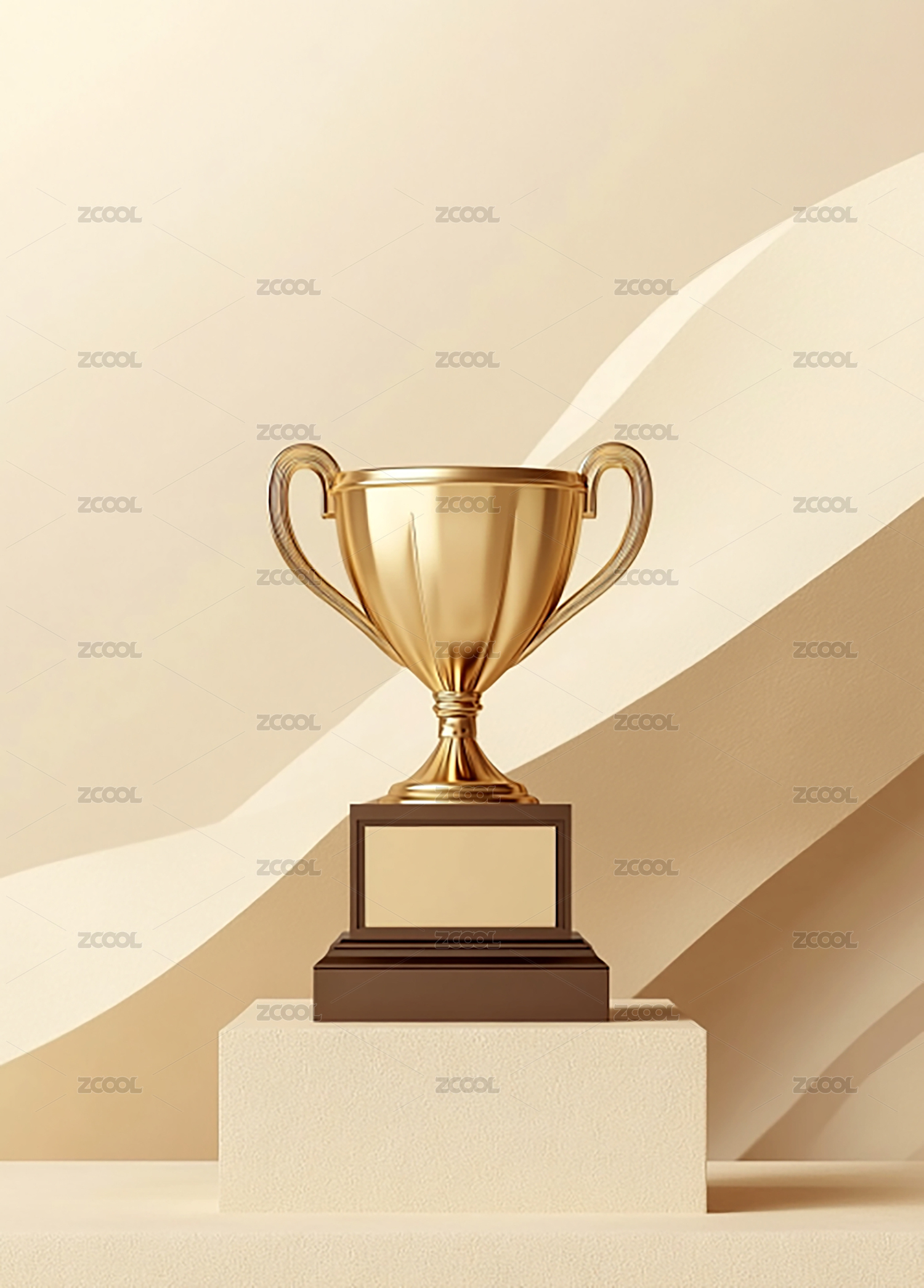 奖品旁基座上的金色奖杯金杯3D卡通插画