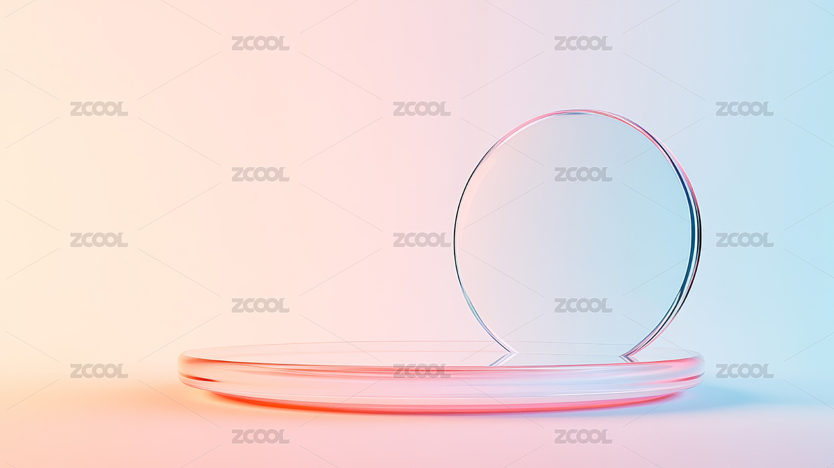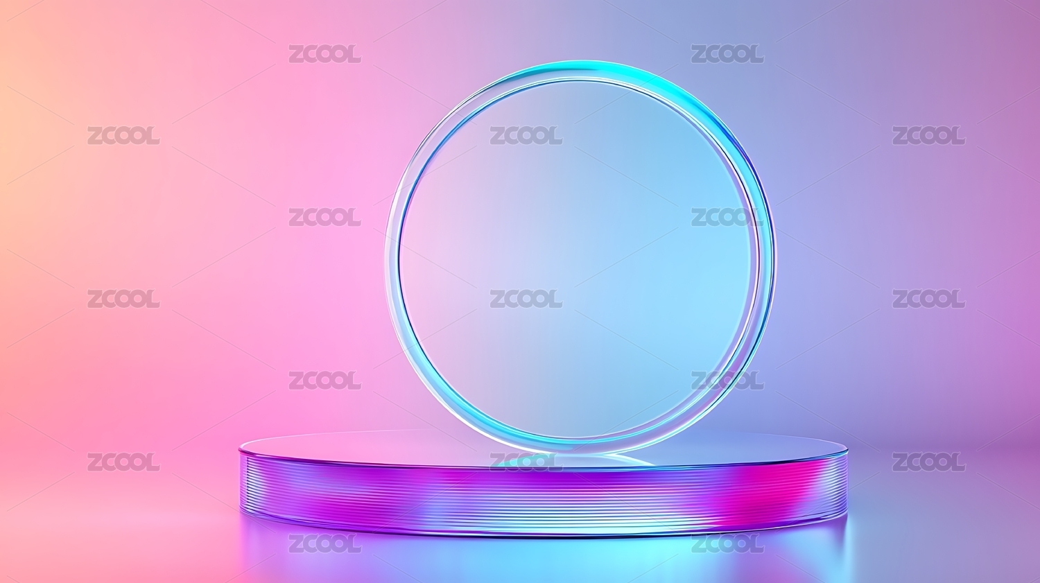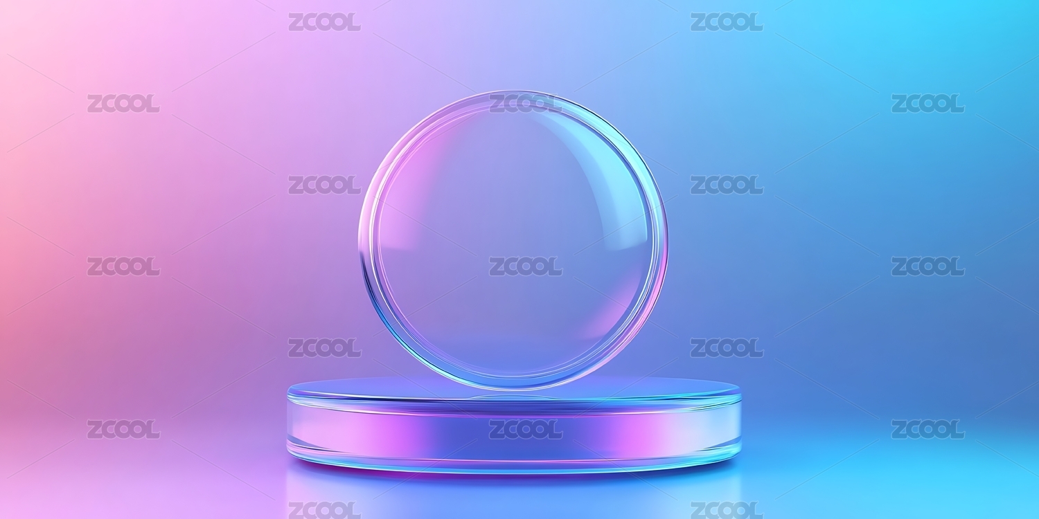 粉色蓝色梦幻背景下悬浮透明圆盘