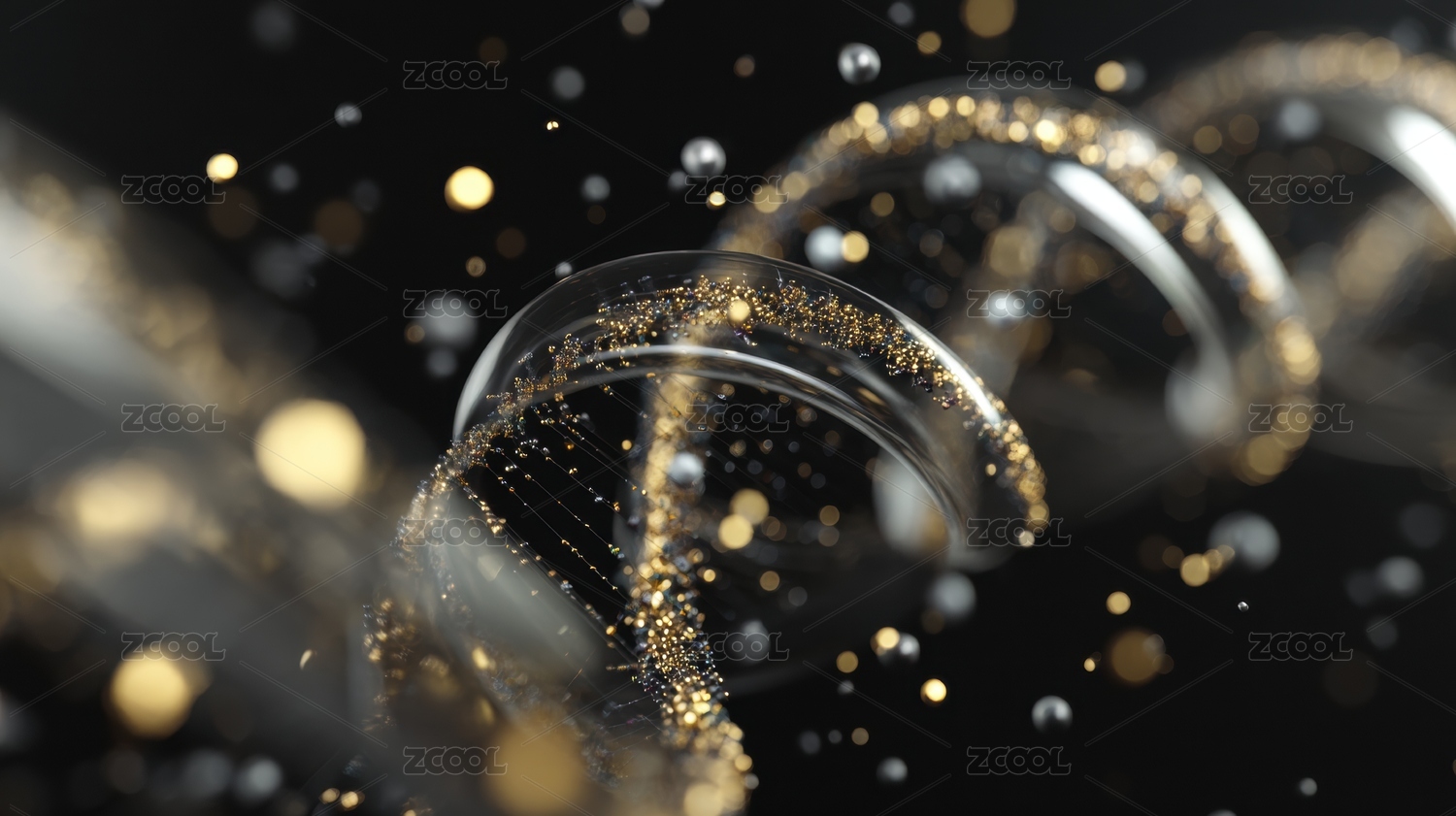 金色粒子在透明气泡中漂浮