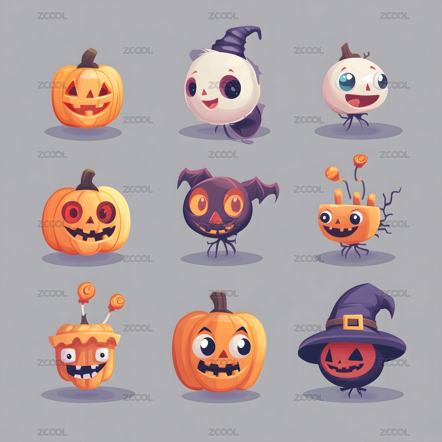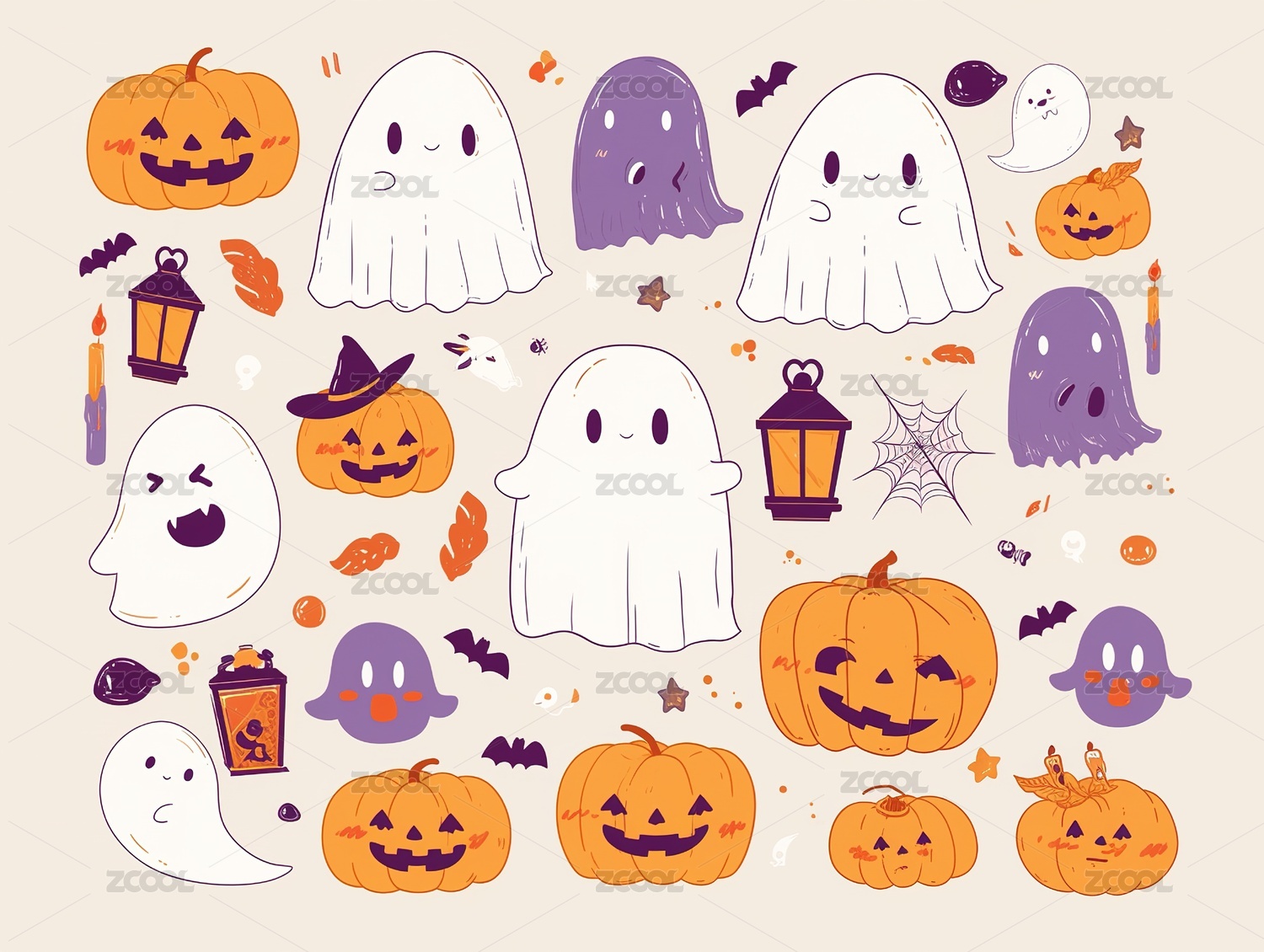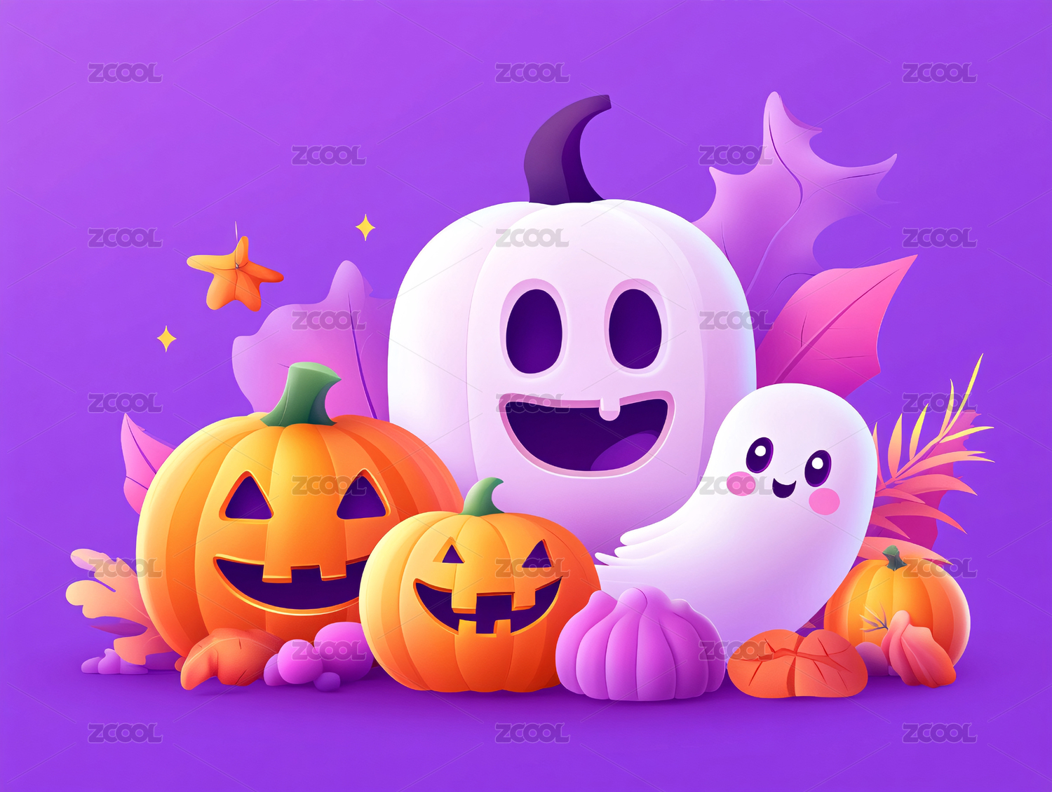紫色卡通南瓜幽灵糖果蝙蝠猫骷髅元素