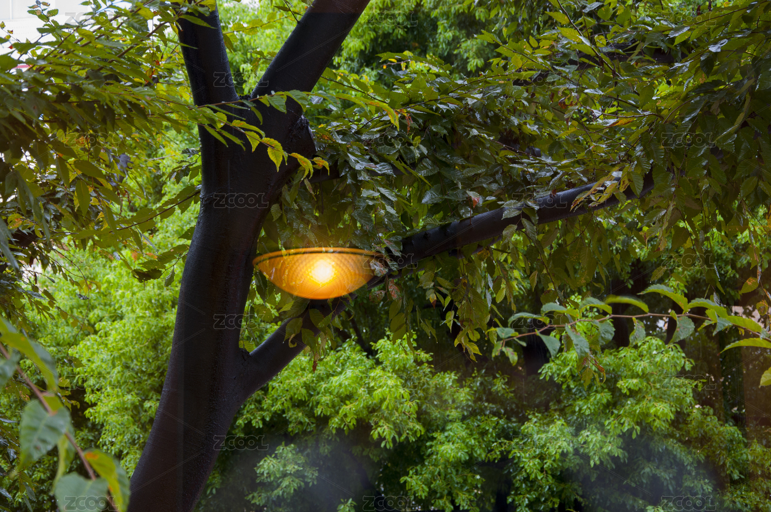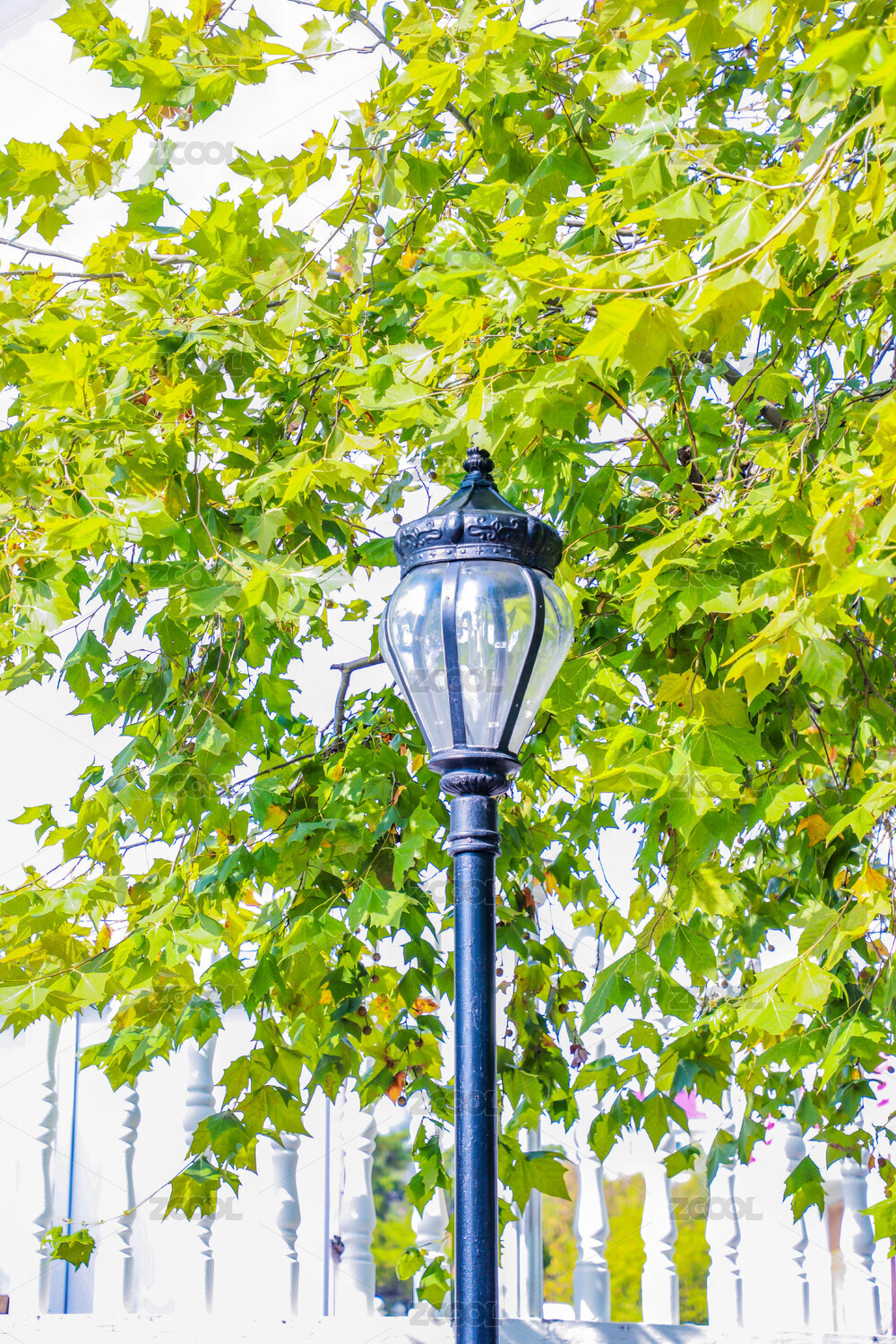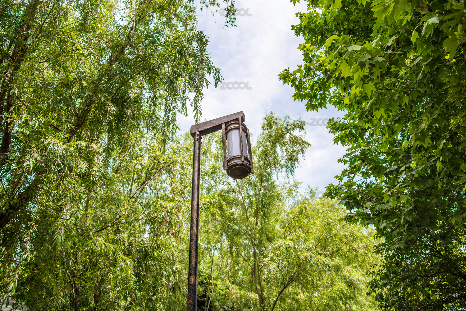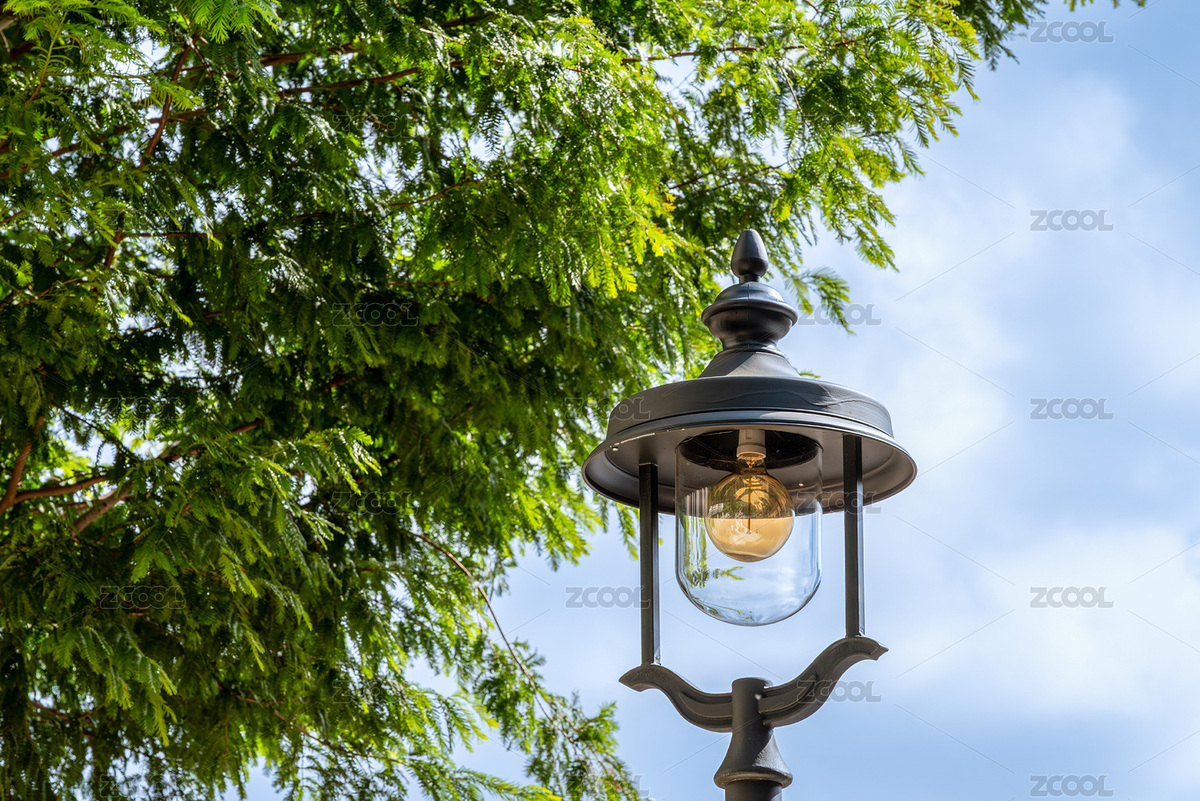 仰视墨绿色的欧式铸铁灯柱上的四盏路灯