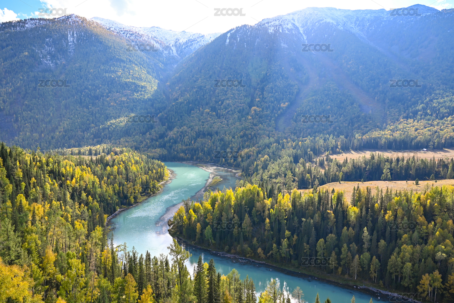 中国秋天喀纳斯卧龙湾 雪山森林与碧绿河水