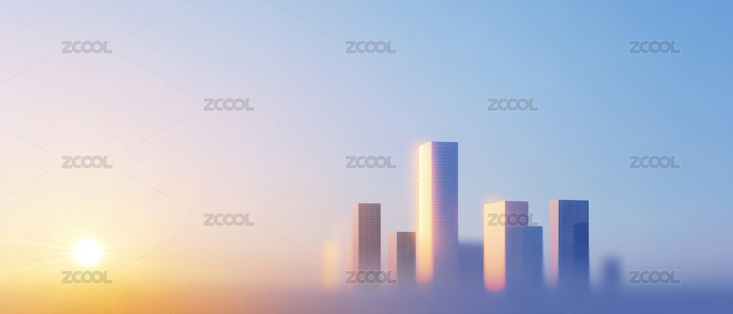 薄雾中阳光洒在摩天高楼上的城市早晨