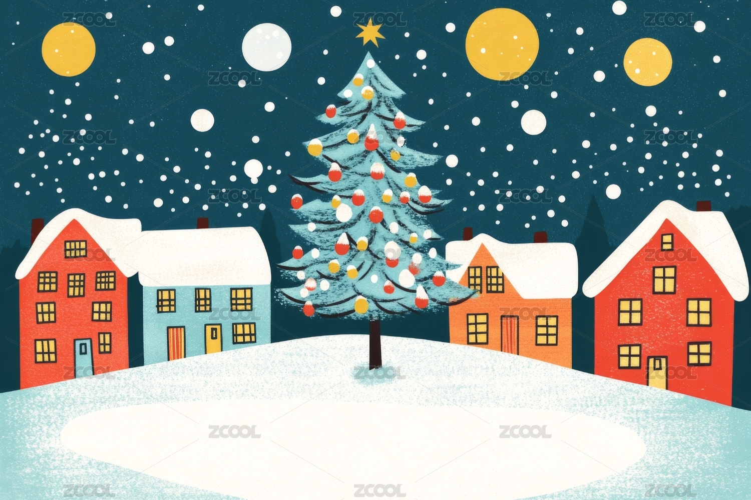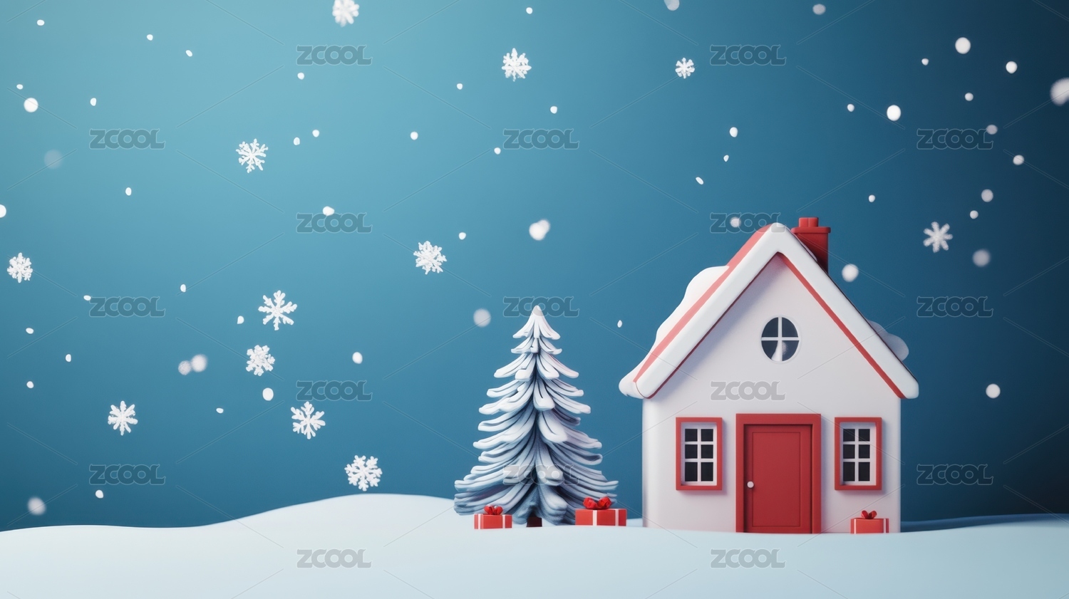 DXCZ202402,圣诞,圣诞节,节日,冬季,雪花,氛围,圣诞树,雪地,房屋